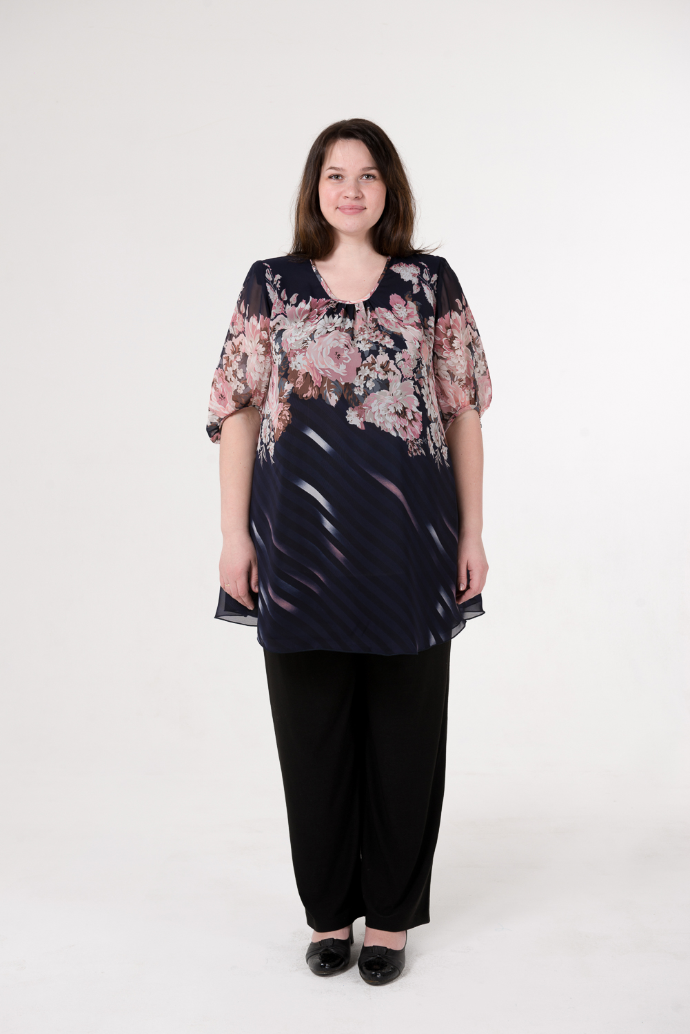 Блузка (туника) из шифона на подкладке. Материал - шифон-стрейч.Полочка и спинка цельнокройные. Округлый вырез горловины обработан кантом, под вырезом заложены складки. Широкий втачной рукав на подплечнике, с узким кантом и складками по краю. Низ изделия обработан оверлочным швом. Длина по спинке 80 см