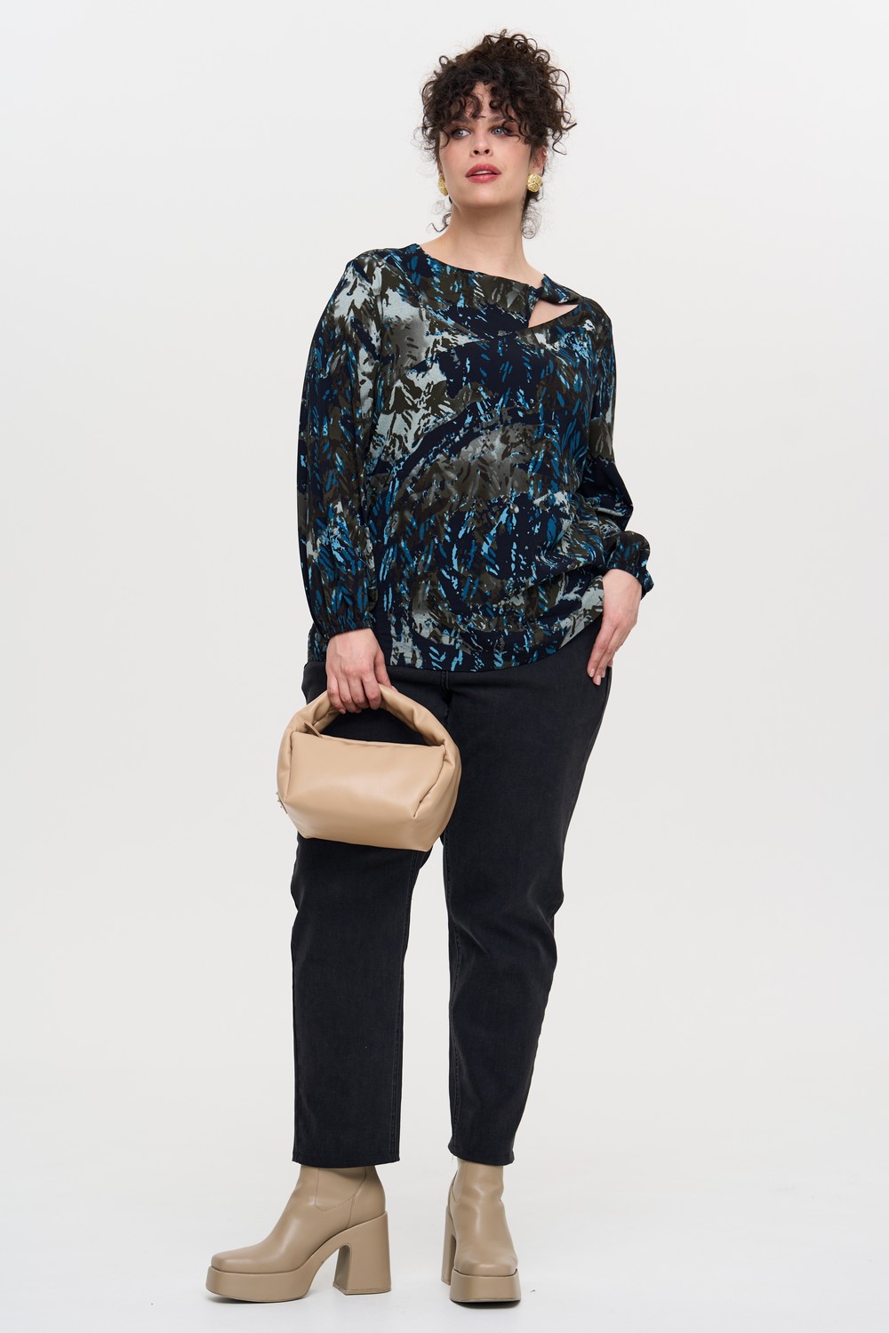 Блузка (туника) из шифона на подкладке. Материал - шифон-стрейч.Модель свободного покроя, сильно расклешена книзу. Блуза двухслойная: нижний слой - однотонный шифон, верхний - шифон с принтом. Полочка и спинка цельнокройные. Округлый вырез горловины обработан кантом, под вырезом заложены складки. Широкий втачной рукав на подплечнике, с узким кантом и складками по краю. Низ изделия обработан оверлочным швом. Длина по спинке 80 см