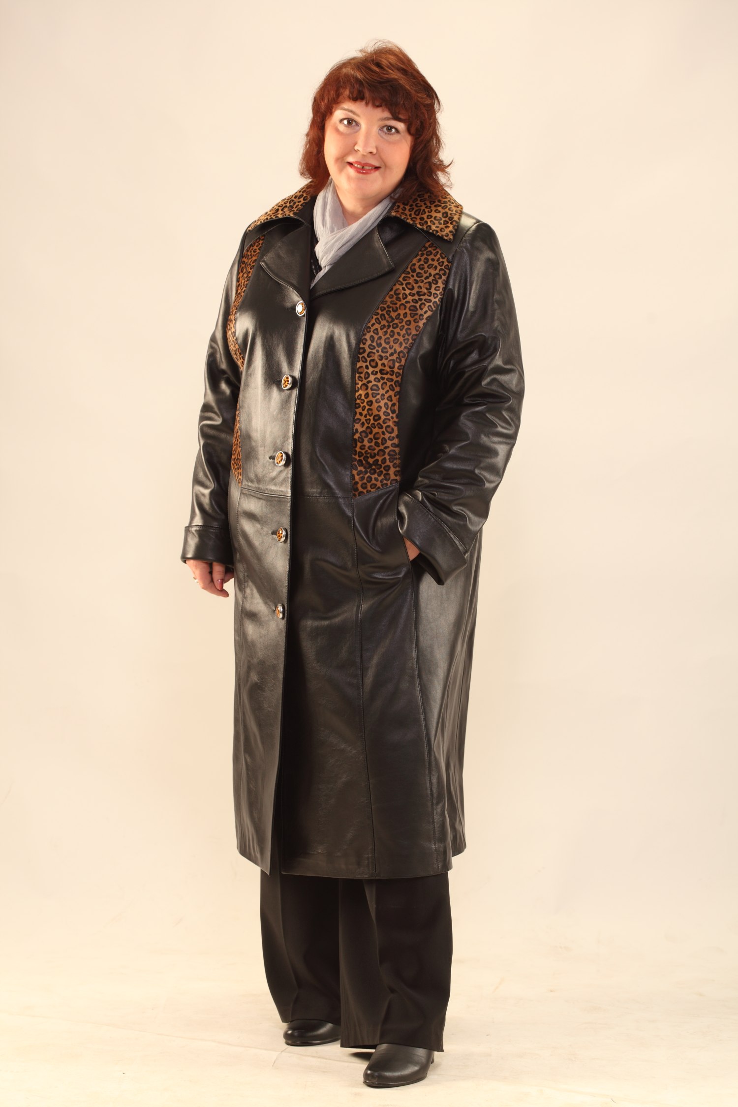 Описание: Пальто женское комбинированное из натуральной кожи и меха теленка леопардовой окраски. Силуэт слегка притален. силуэта. Воротник на стойке с лацканами. Карманы расположены в рельефах. Основной материал: натуральная кожа Капюшон: без капюшона Длина рукава: регулируемая Тип рукавов: втачной Застежка: пуговицы Сезон: теплая зима Комфортная температура: от +5 до -5 Длина по спинке 118 см