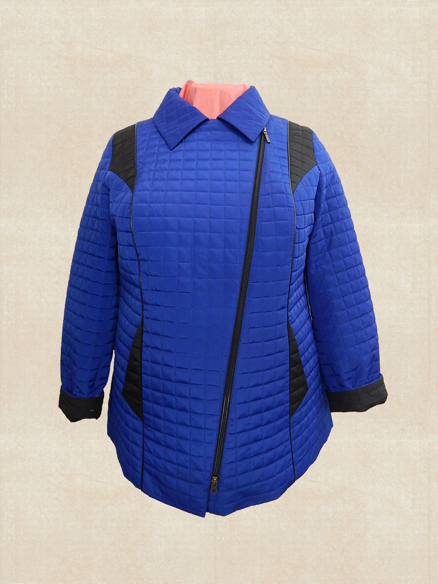 Куртка женская из стеганой плащевки на синтепоне. В модели скомбинированы два рисунка стежки: черная и васильковая клетка. Модная косая застежка – молния позволяет носить куртку застегнутой или отложить воротник в виде лацкана. Карманы с фигурными листочками расположены в рельефах. Черный кант в рельефах и косая черная молния облегчают и вытягивают силуэ и подчеркивают сочный цвет стежки. Основной материал: стеганая плащевка Капюшон: без капюшона Длина рукава: фиксированная Тип рукавов: реглан Застежка: молния Сезон: весна/осень Комфортная температура: от +15 до +5 Длина по спинке: 74 см.