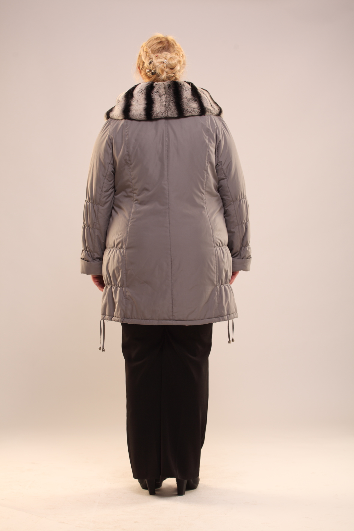 Описание: Пальто женское из плащевки на синтепоне. Округлый воротник с драпировкой дополнен съемным воротником из натурального кролика
