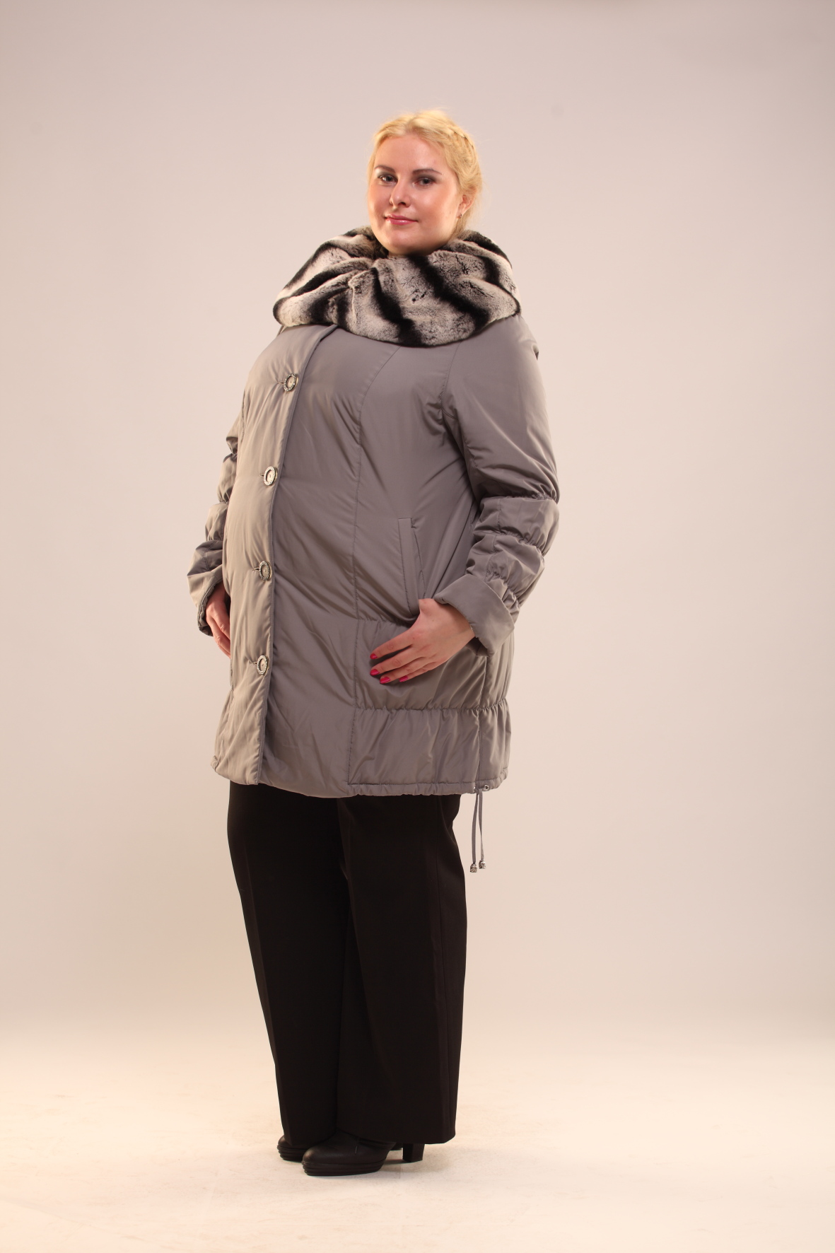 Пальто женское из плащевки на синтепоне. Округлый воротник с драпировкой дополнен съемным воротником из натурального кролика