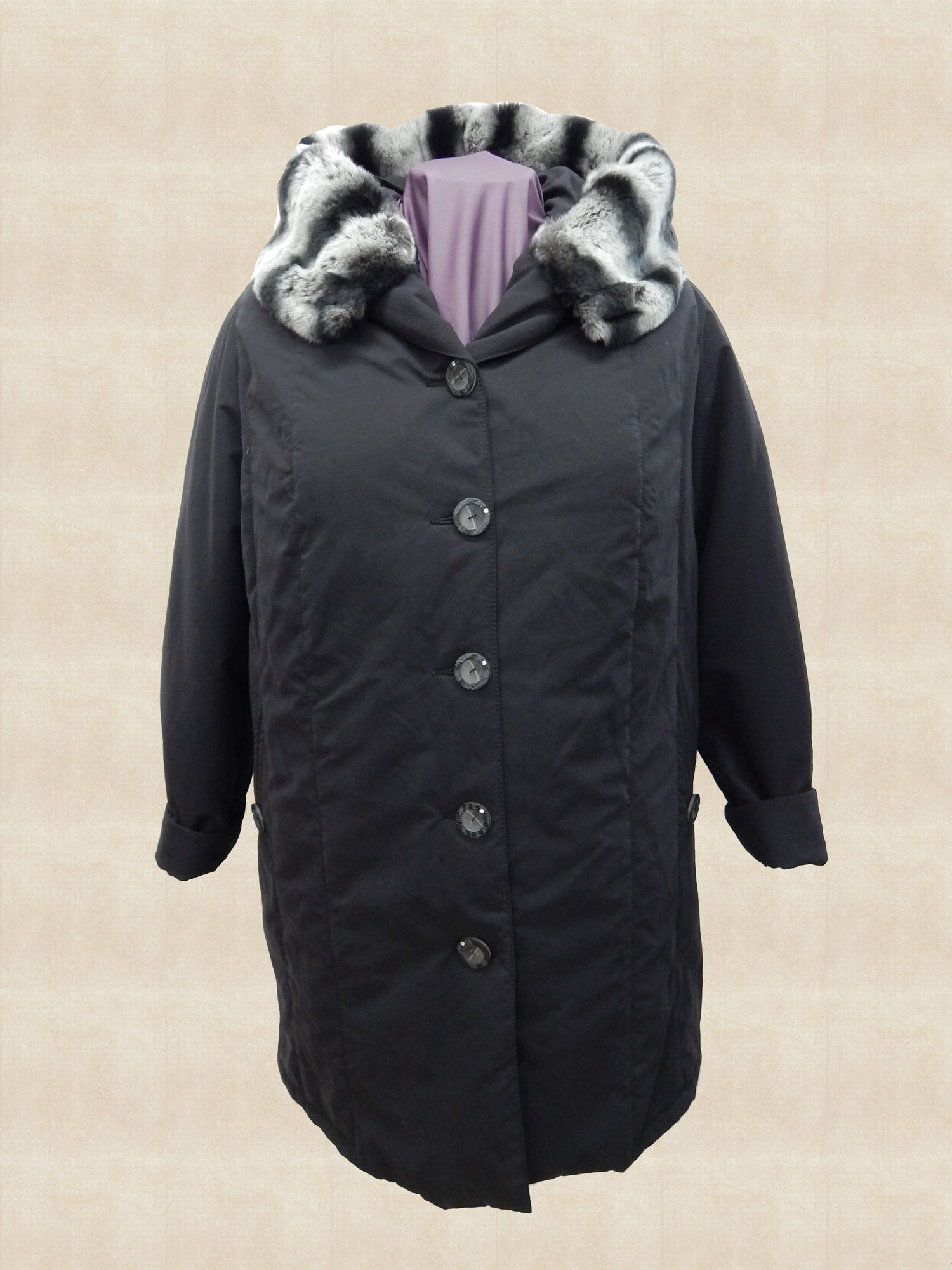 Описание: Пальто женское из плащевой ткани на синтепоне с капюшоном. Съемная опушка капюшона из натурального кролика Рэкс. Карманы с настрочной листочкой расположены в рельефах. Пальто утеплено пристегивающейся подстежкой. Основной материал: полиэстер Капюшон: не отстегивающийся капюшон Длина рукава: регулируемая Тип рукавов: полуреглан Застежка: пуговицы Сезон: холодная зима Комфортная температура: от -5 до -25 Длина по спинке: 92 см. Материал верха: полиэстр 100%.