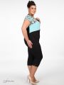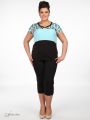 Брюки- капри из эластичной ткани. Объем по низу модели регулируется манжетами с пуговицами. На передних половинках, в области колен, застрочены вытачки. По всему периметру пояса проходит эластичная тесьма-резинка.