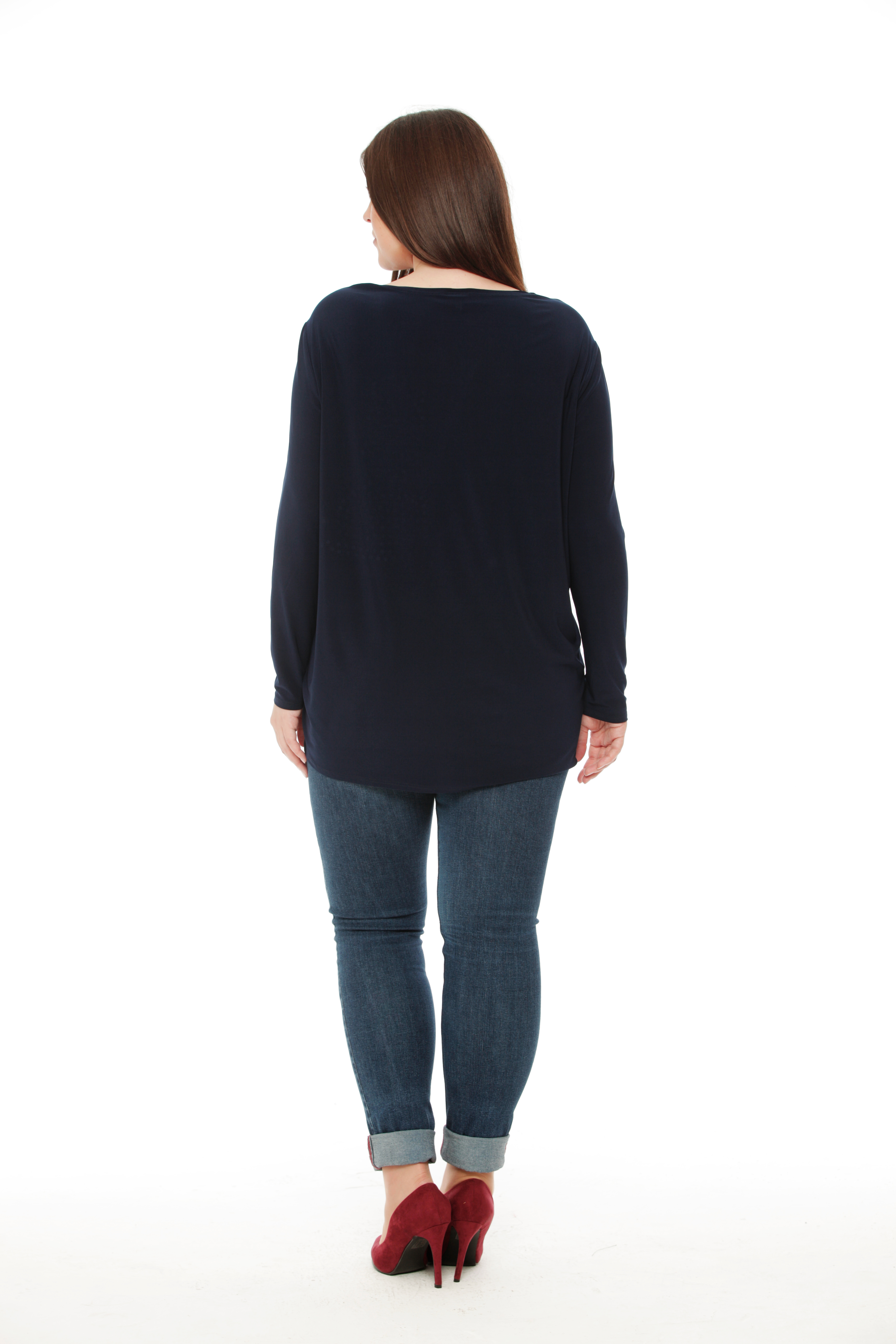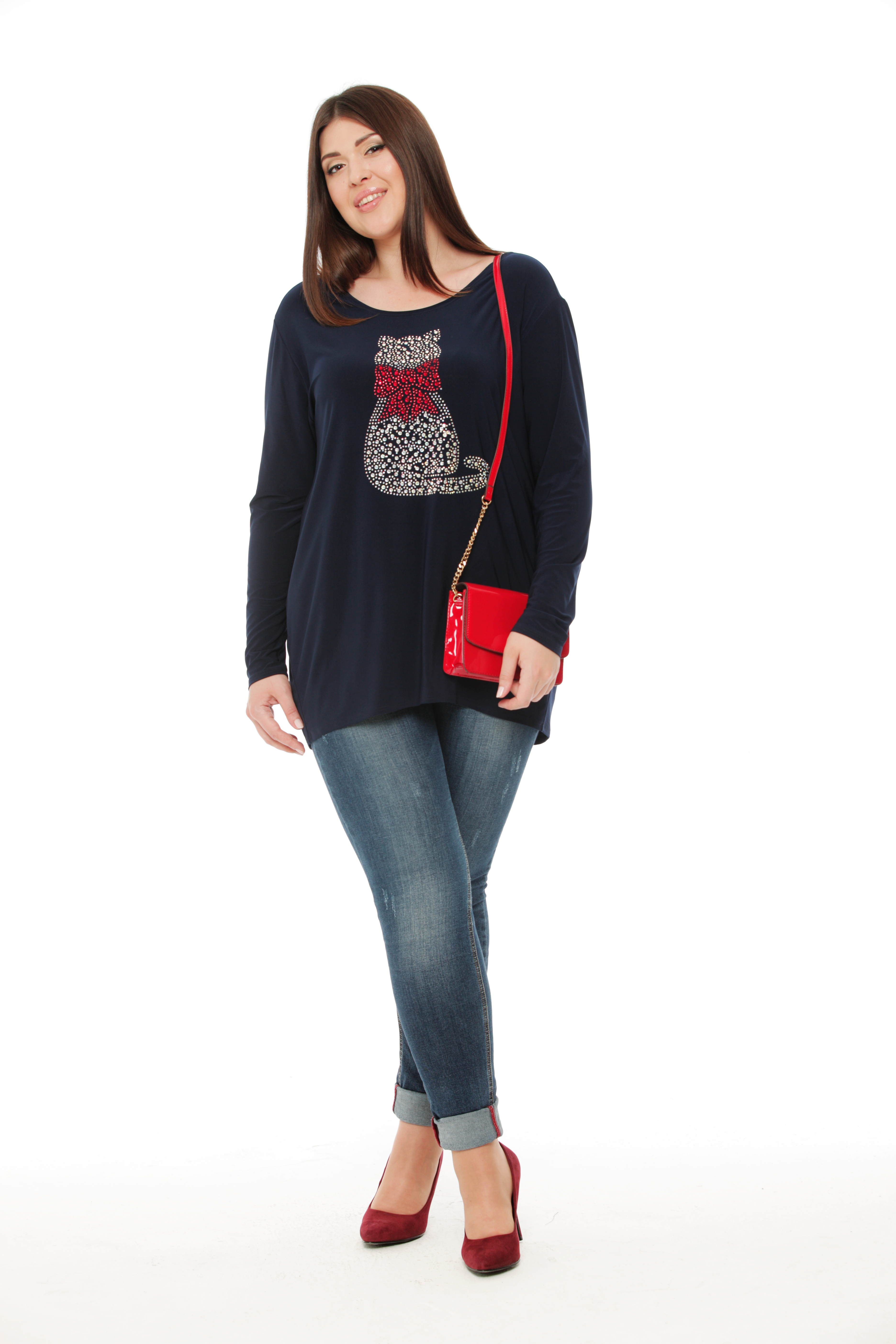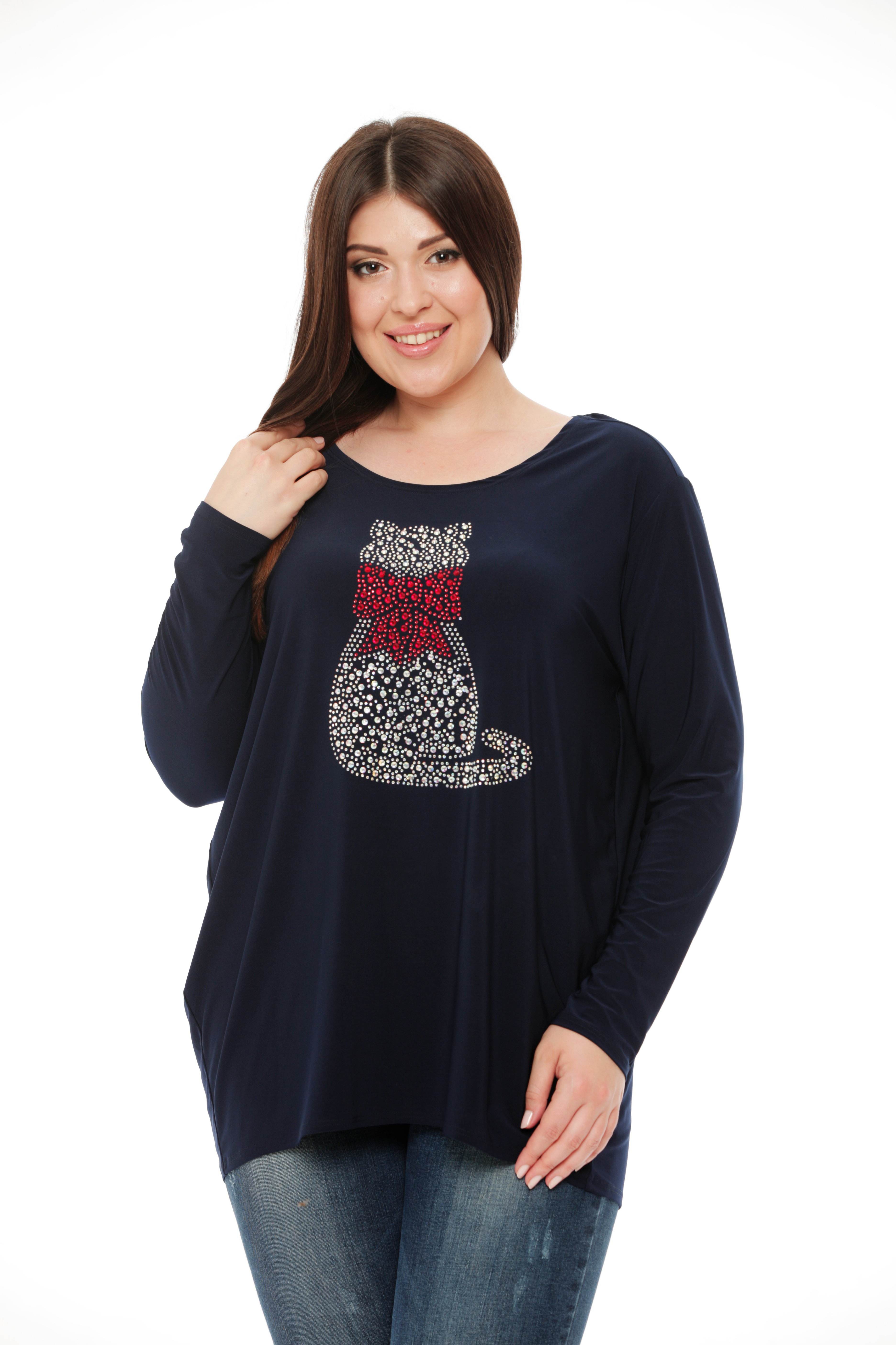 Шикарный удлиненный блузон, выполненный из вискозного полотна, приятно прилегает к телу, создает комфортные ощущения во время носки. На полочке расположен принт из страз - кошка.