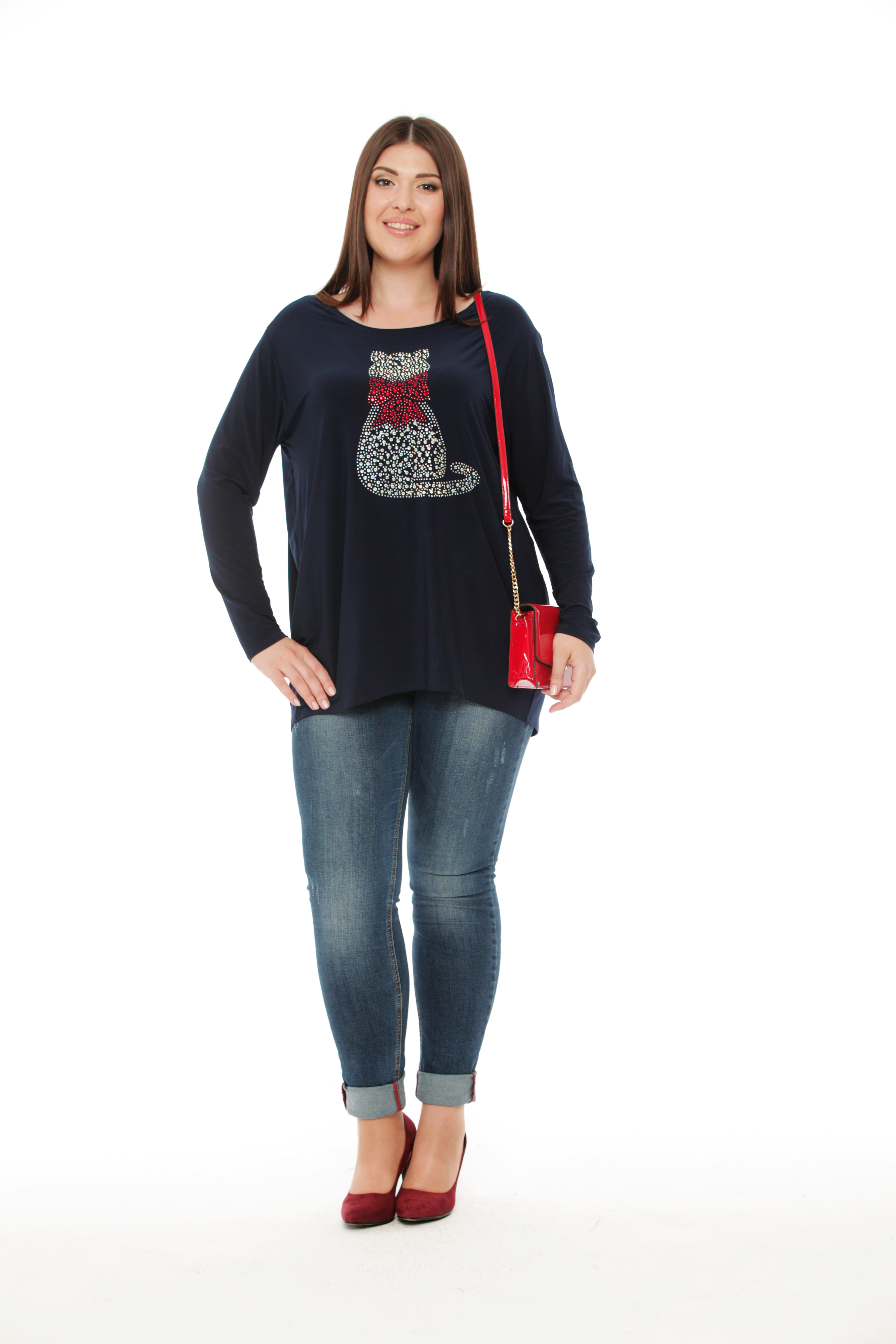 Описание: Шикарный удлиненный блузон, выполненный из вискозного полотна, приятно прилегает к телу, создает комфортные ощущения во время носки. На полочке расположен принт из страз - кошка.