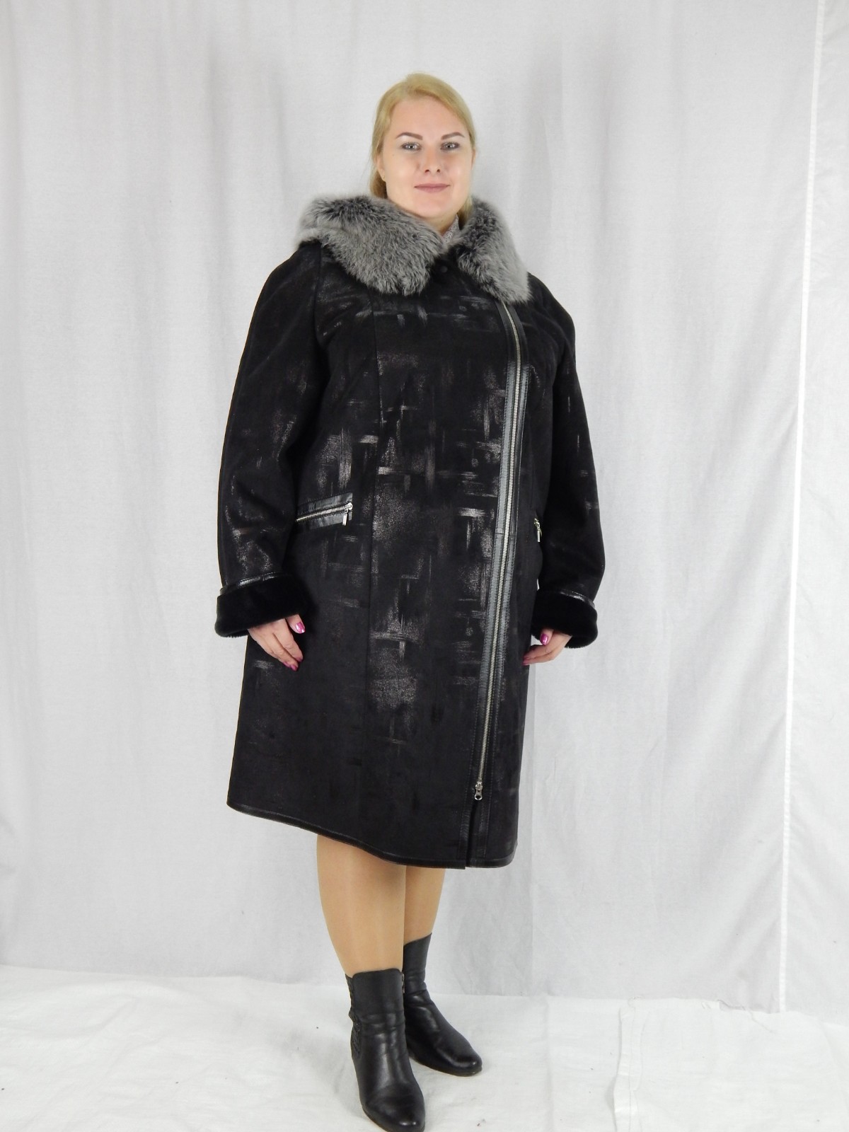 Дубленка женская из высококачественного эко-меха южно-корейского производства. Модель выглядит современно и динамично за счет застежки-молнии, расположенной наискосок и прорезных карманов на молнии.Отделка карманов и кант застежки-молнии из натуральной кожи. Отворот капюшона из натурального меха Тоскана. Основной материал: эко-мех Капюшон: не отстегивающийся капюшон Длина изделия: 100 Длина рукава: регулируемая Тип рукавов: полуреглан Застежка: молния Сезон: холодная зима Комфортная температура: от -5 до -25