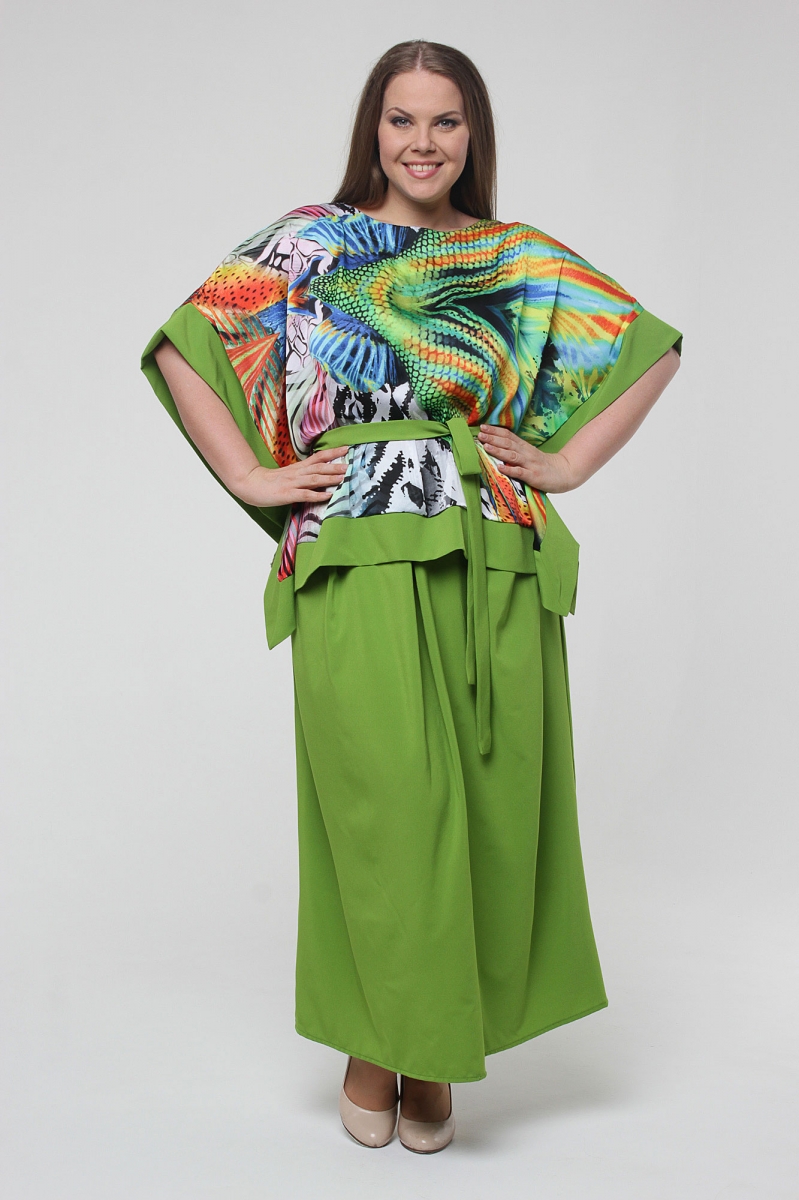 Комплект состоит из блузки квдратного кроя на поясе и юбка на резине со складками.