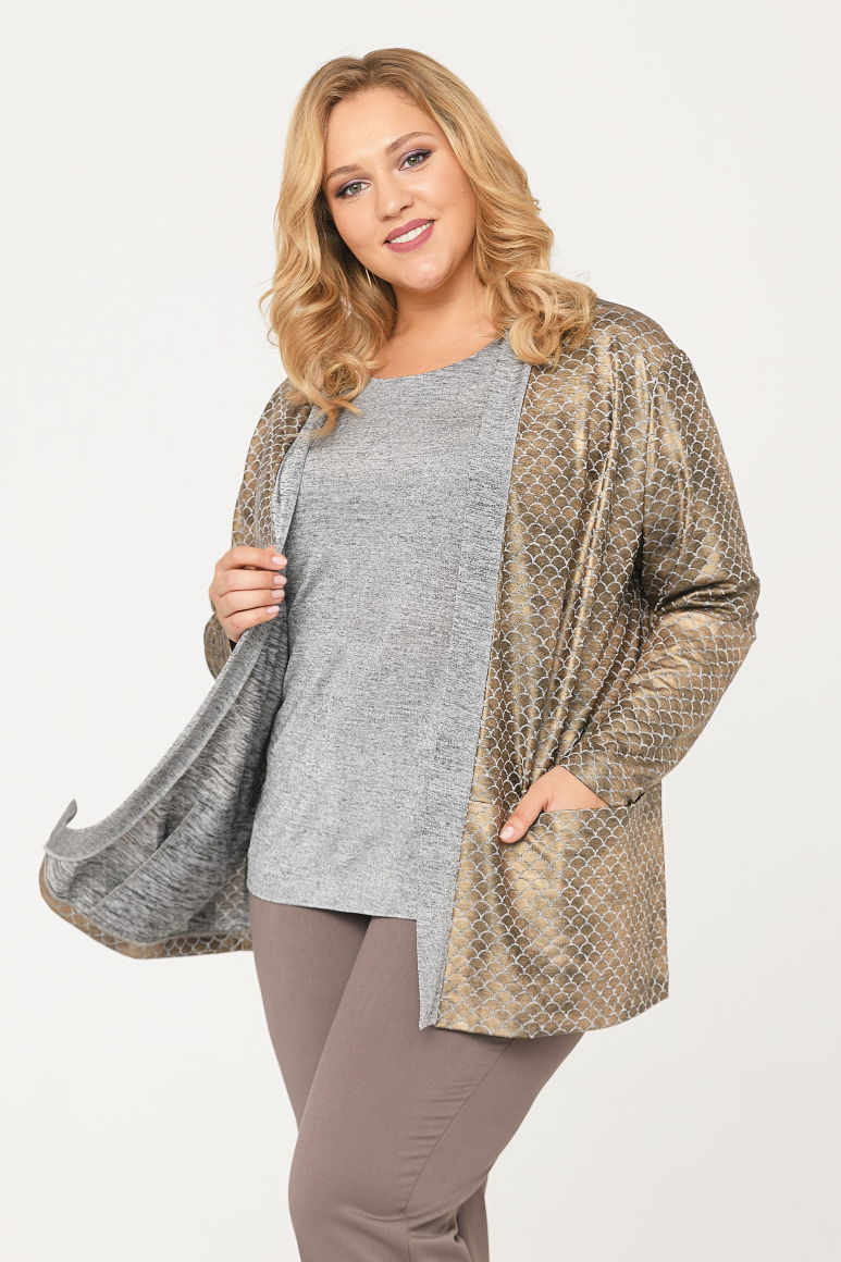 Классический комплект состоящий из топа и кардигана незаменимая вещь в гардеробе. Двойка уникальна своим сочетанием простого удобного кроя и необычной ткани. Кардиган выполнен из меланжевого трикотажа с золотистым накатом с рисунком в виде «ракушек». Топ приталенного силуэта с коротким рукавом, кардиган свободного кроя с накладным карманами и длинным рукавом.