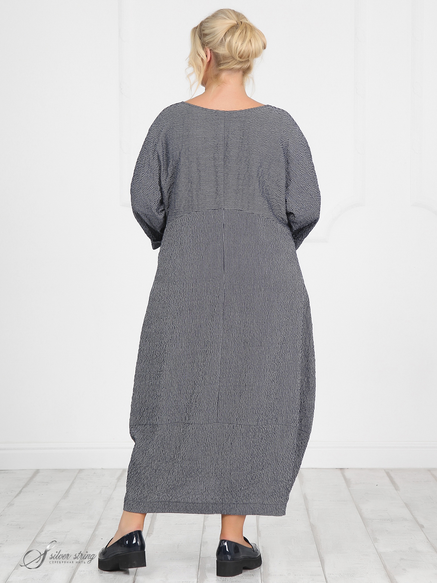 Шикарное длинное платье свободного кроя. Горловина округлой формы. Рукав немного спущенный, длина 3/4. Низ рукава с отворотом. На полочке два накладных кармана, на одном из которых приколота декоративная булавка. За счет формы, разного расположения полосы и фактуры ткани, платье смотрится очень эффектно. В этой модели Вы будете чувствовать себя очень комфортно.