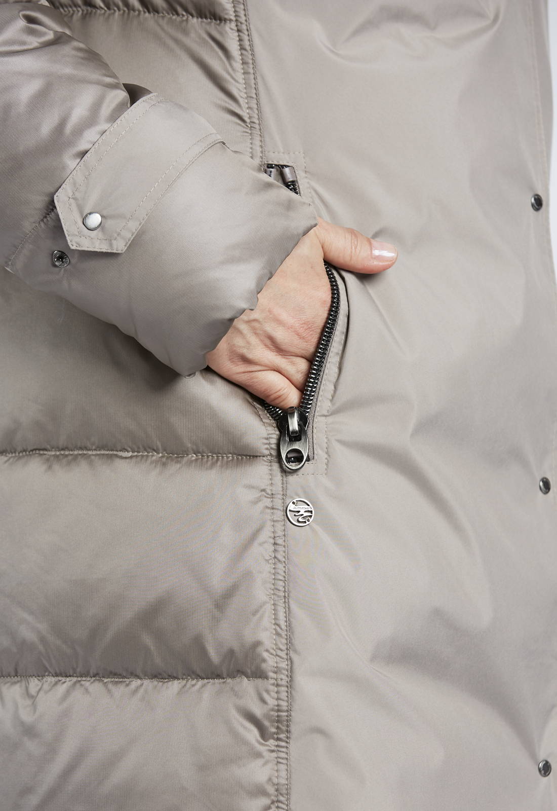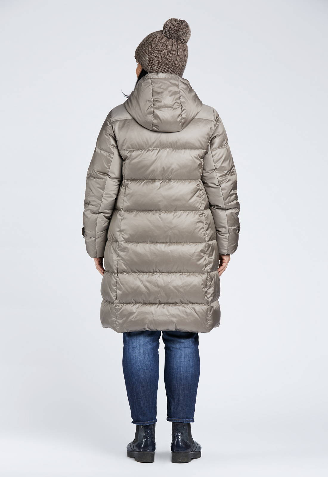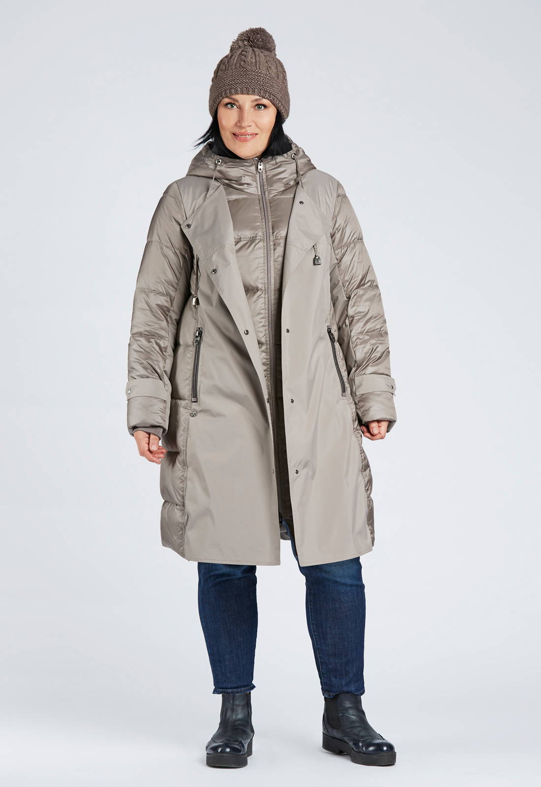 Описание: Интересное стеганое пальто средней длины с декоративными бортами на кнопках по переду изделия. Центральная застежка на молнию. Удобный капюшон на кулиске.