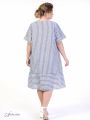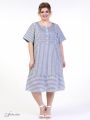 Отличное летнее платье прямого силуэта с притачным воланом по низу модели. Рукав втачной, с отворотом, длиной до локтя. В изделии используются ткани-компаньоны из натурального волокна с рисунком в полоску, что является безусловным трендом сезона. Горловина округлой формы. На полочке расположена подкройная кокетка с планкой-застежкой на пуговицы. Различное направление рисунка вносит в модель графичность и динамику. Платье прекрасно подойдет для летнего отдыха