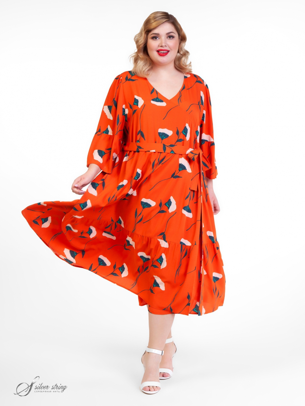 Легкое платье из натуральной ткани с оригинальным цветочным рисунком. Модель с завышенной линией талии. Нижняя часть полочки обработана с широким «запахом» и оканчивается воланом. Модель комплектуется съемным поясом. Горловина У-образной формы. Рукав втачной, слегка присобран по окату, длиной ?. По низу рукава притачен легкий волан. Удобный крой модели скрывает возможные недостатки фигуры, а оригинальный дизайн позволит выглядеть модно и стильно .