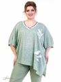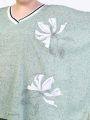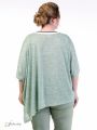 Оригинальная трикотажная блуза свободного кроя. Модель выполнена из струящегося меланжевого трикотажного полотна. Рукав цельнокроеный, длиной за локоть. Левая сторона изделия скроена по более прямой линии и заметно длиннее правой стороны. В левом боковом шве обработан высокий разрез. Аппликация из парных цветочных бутонов, расположенных на левой части полочки, подчеркивает асимметричность кроя. V-образный вырез горловины обработан эластичной вязаной планкой. Эту модель отличает удобство непринуждённость, она отлично маскирует проблемные зоны фигуры.