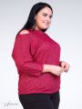 Нарядная трикотажная блуза из смесового волокна с добавлением люрексовой нити серебряного цвета. Изделие с цельнокроеным рукавом покроя «летучая мышь», длиной 3/4. Модель имитирует комплект, состоящий из блузона с У-образным глубоким вырезом, надетым поверх блузы с высоким «воротником-гольф». Это впечатление создают узкие щели, намеренно обработанные на уровне плечей, в шве углового подреза. Аппликация из термохельнетенов усиливает эффект обманки. Изысканный материал и оригинальный крой делают модель запоминающейся и торжественной