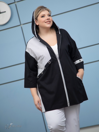 Описание: Оригинальный блузон прямого силуэта, с капюшоном, выполнен из тканей-компаньонов с высоким содержанием хлопка. Модель с удлиненной линией плеча и рукавом, длиной 3/4. На правой полочке расположена асимметричная кокетка из отделочной ткани. Контрастная отделка проходит по лицевому срезу капюшона, вдоль застежки-молнии по борту и по карману на левой полочке. Подрезы по левому рукаву и по середине спинки подчекнуты отлетными складками из отделочного материала с декором из крупных металлических люверсов. Это оригинальная модель, которая прекрасно впишется в Ваш гардероб и станет незаменимой при создании разнообразных комплектов