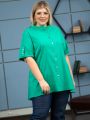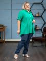Описание: Блуза трапециевидного силуэта, с воротником – стойкой и застежка на пуговицы. Модель выполнена в спортивном стиле из однотонной эластичной ткани с высоким содержанием хлопка. Рукав втачной с отворотом по низу. От горловины, вдоль линии плеча, с переходом на рукав, расположена пата, которая фиксируется на пуговицы. Асимметрично оформленная линия низа удлинена по спинке. Такой крой отлично маскирует проблемные зоны, стройнит фигуру и дарит ощущение свободы и комфорта.