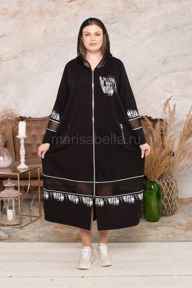 Описание: Кардиган выполнен из мягкой трикотажной ткани, капюшон и вставки - из сетки с фатином, отделка - принт.