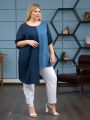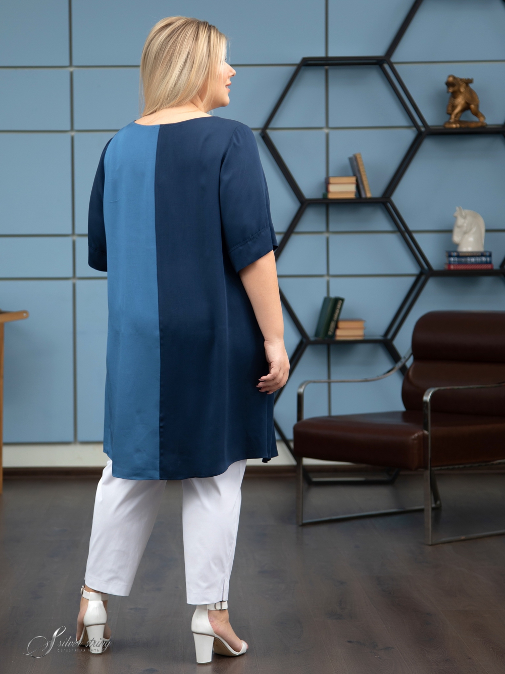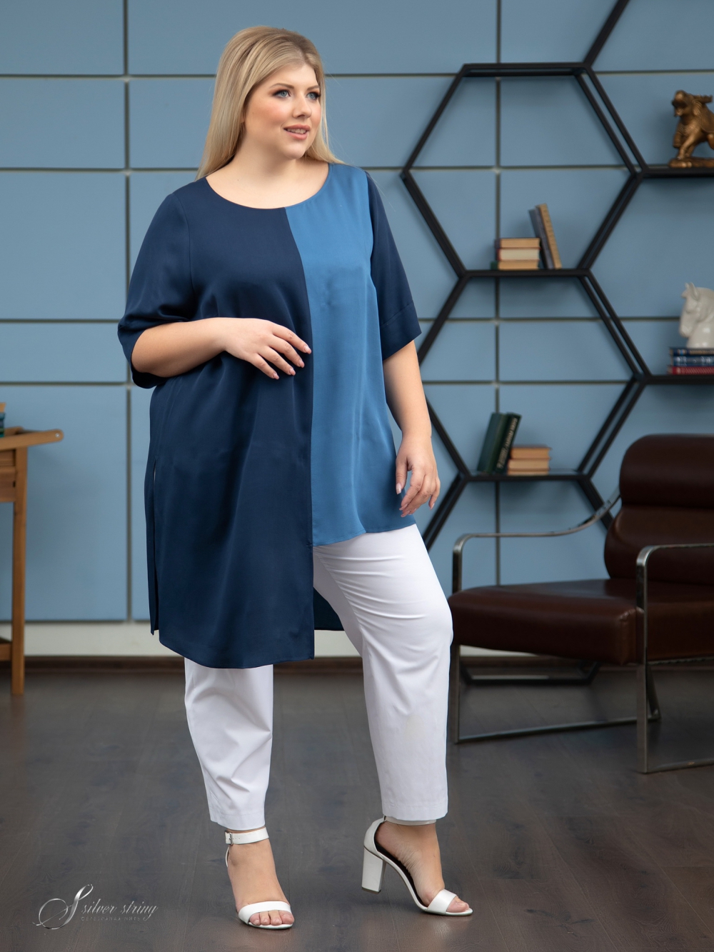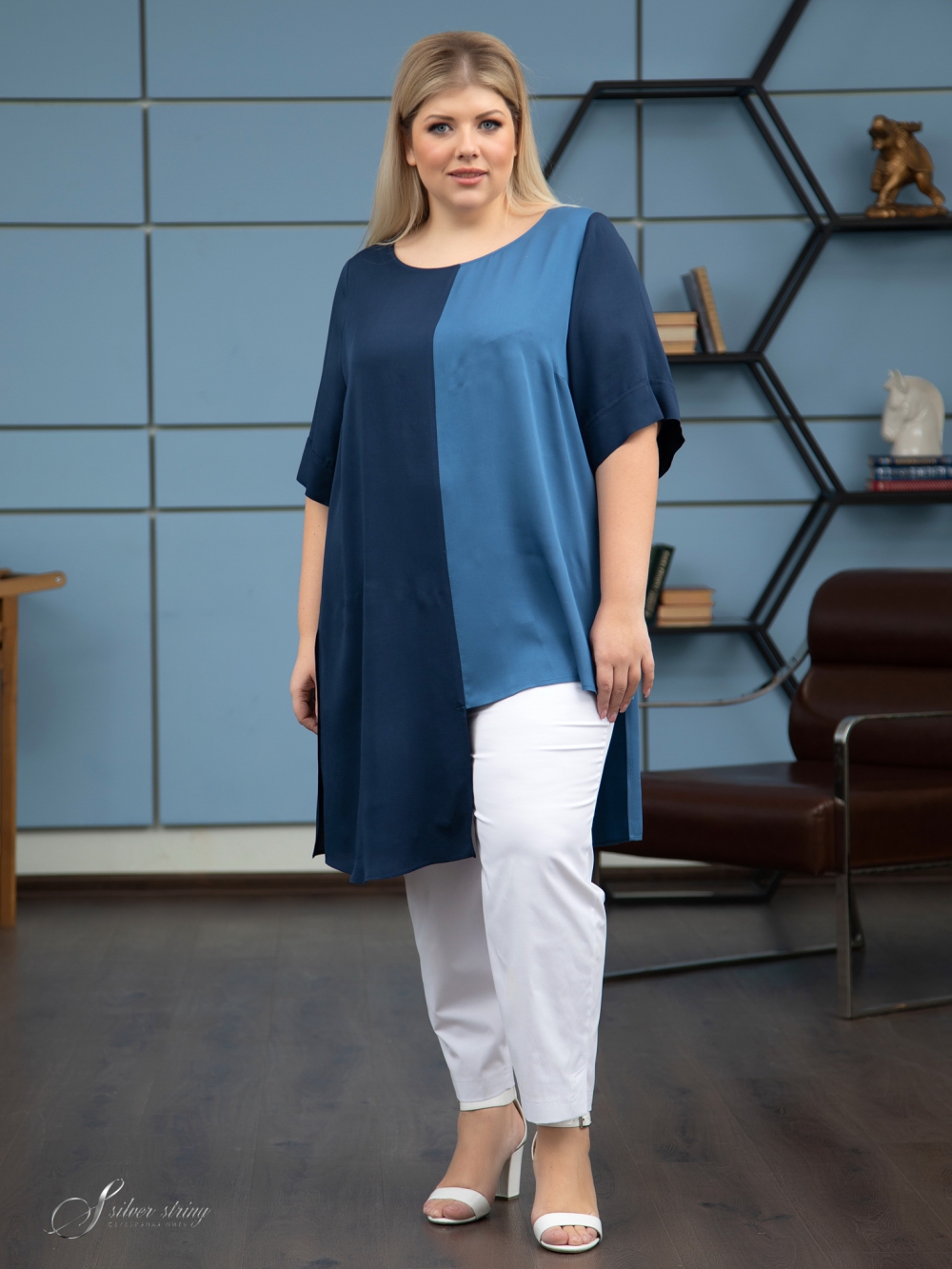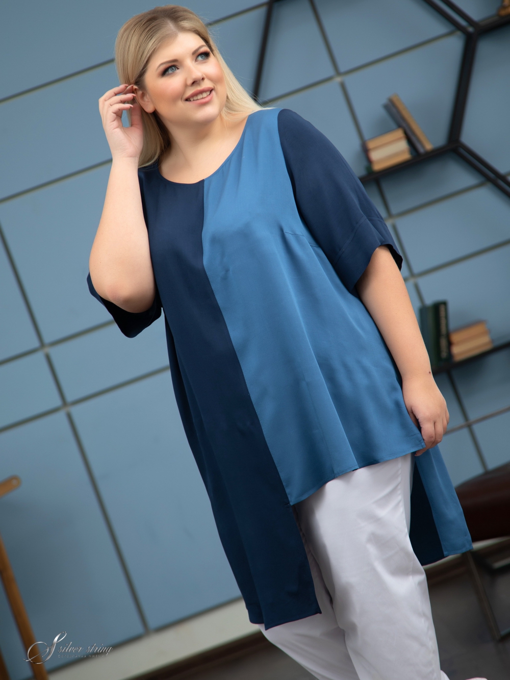 Модная удлиненная туника прямого силуэта выполнена из тканей- компаньонов, с высоким содержанием натурального волокна . Сатиновое переплетение нитей в полотне, придает материалу бархатистость и приятный блеск . Полочка и спинка имеют вертикальные сечения по центру деталей. Левая часть полочки значительно короче основной длины. Эффект асимметрии усилен за счет того, что левые и правые части изготовлены из тканей разного цвета. Линия горловины округлой формы, слегка расширена к плечам. Рукав втачной, просторный, длиной за локоть. За счет графичного кроя, изделие позволяет зрительно сделать фигуру стройнее, придавая легкость Вашему образу.
