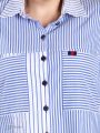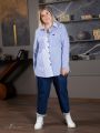 Оригинальная блуза-рубашка в спортивном стиле, изготовлена из эластичных тканей-компаньонов с высоким содержанием хлопка. Модель прямого силуэта, с рубашечным воротником на стойке и с длинным втачным рукавом на манжете. На полочке и спинке расположены подрезные кокетки. Вдоль линии кокетки спинки притачен декоративный пластрон, закрепленный по углам пуговицами. К низу от кокеток полочки настрочены крупные накладные карманы. Вход в карман оформлен фигурным подрезом. Центральная часть правой полочки выполнена из отделочной ткани, аналогичная ткань используется для воротника, спинки и для отделки рукава. По борту обработана застежка на пуговицы, петли выполнены контрастным красным цветом. Застежка по рукаву осуществляется с помощью декоративной паты, которая захватывает противоположный край манжеты через петлю и фиксируется на парные пуговицы, таким образом, регулируя объем по запястью. В боковых швах блузы обработаны разрезы. Высококачественный материал и отличный крой изделия гарантируют безупречную посадку и комфорт.
