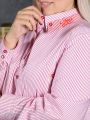 Описание: Современная блуза-рубашка прямого силуэта с рубашечным воротником и застежкой на яркие пуговицы. Модель изготовлена из полосатой ткани с высоким содержанием хлопка и эластана. Рубашка с удлиненной линией плеча и длинным втачным рукавом с манжетой. Воротник в модели перегибается по отлету на лицевую сторону и фиксируется, по уступам, пуговицами. На полочке настрочены крупные накладные карманы, боковые стороны которых отвернуты по косой линии, формируя вход в карман. Шов подрезной кокетки, на спинке, проходит под углом и подчеркнут треугольной декоративной патой . Вдоль отлета воротника и по низу правого кармана расположен небольшой яркий принт. При создании принта использовался специальный пластификатор, который позволяет рисунку выдерживать длительную эксплуатацию изделия. В боковых швах обработаны высокие разрезы. Удобный крой модели скрывает возможные недостатки фигуры, а оригинальный дизайн позволит выглядеть модно и стильно.