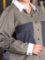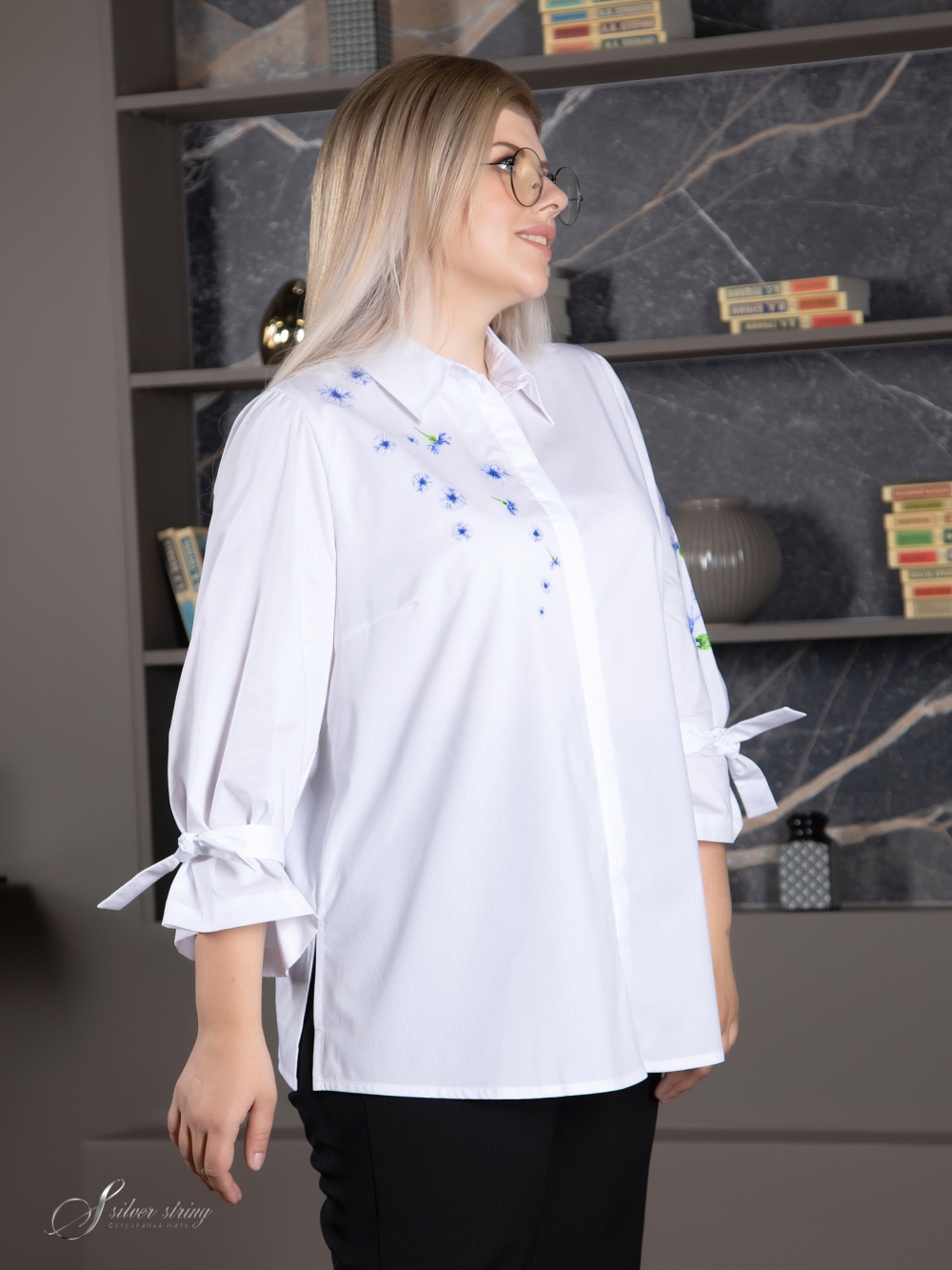 Эффектная блуза прямого силуэта в стиле «Casual» выполнена из гладкокрашеных тканей-компаньонов с высоким содержанием хлопкового волокна. Особого внимания заслуживает качество материала. Переплетение нитей в полотне придает ткани шелковистость и приятный блеск. Воротник рубашечный, на стойке. Рукав длинный, с притачной манжетой. Обхват манжеты можно корректировать с помощью парных пуговиц. На полочке обработаны накладные карманы с боковым входом. По борту расположены контрастные планки с застежкой на пуговицы. В боковых швах обработаны разрезы. Комбинация яркой ткани и принтов придает изделию динамику и графичность, что в сочетании с отличной посадкой позволит Вам выглядеть современно и стильно.