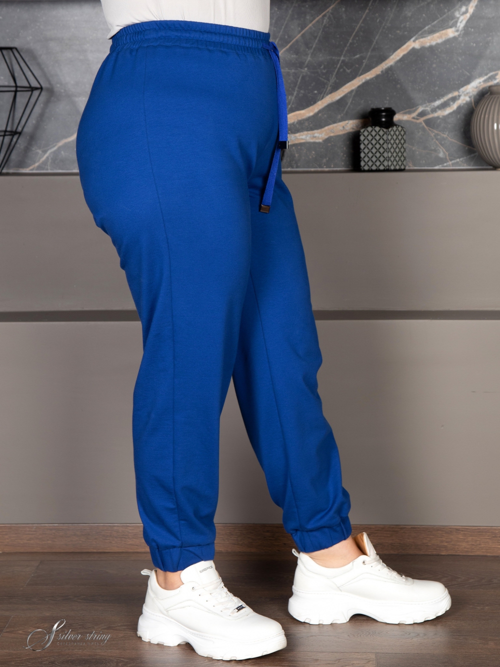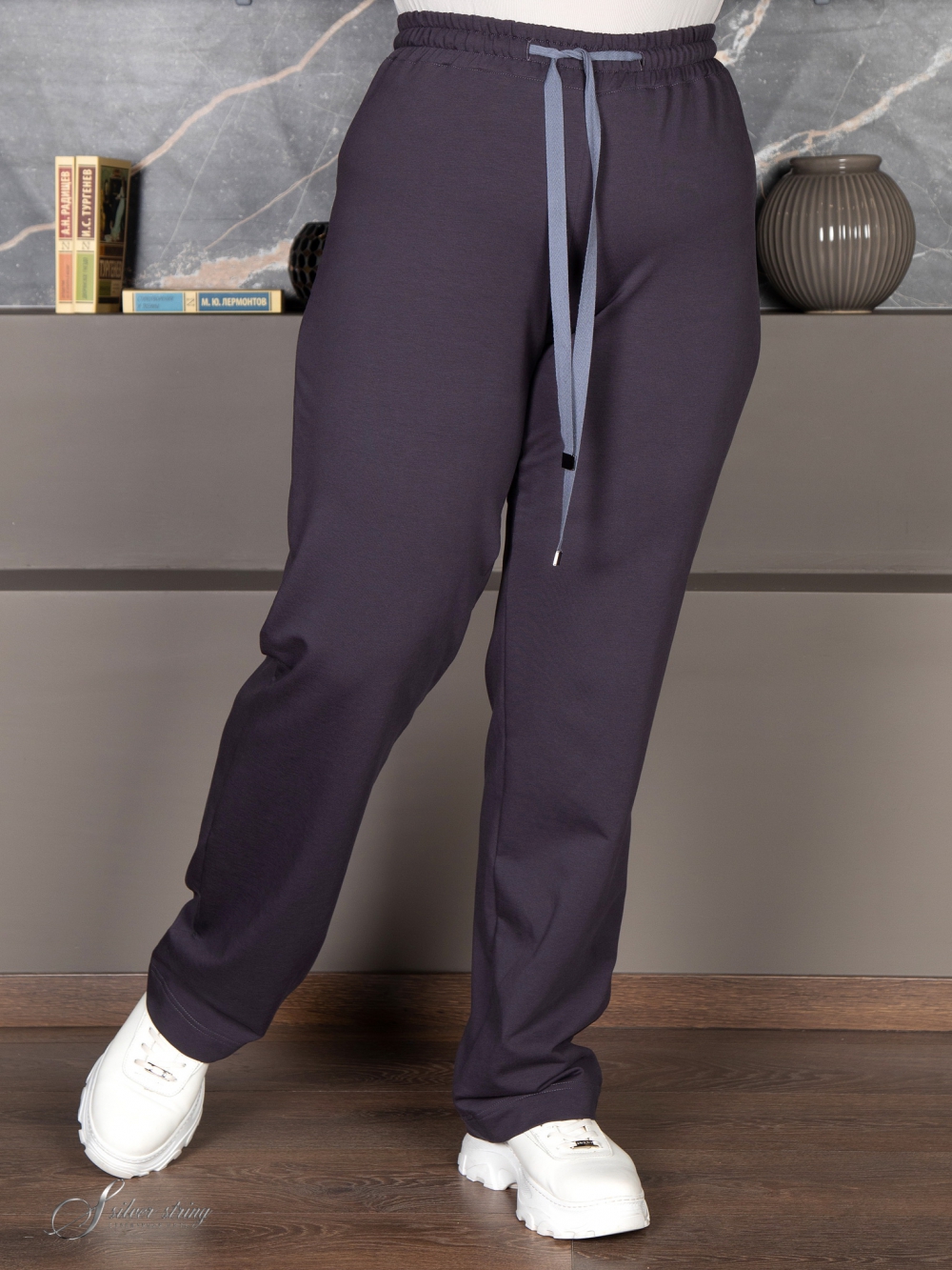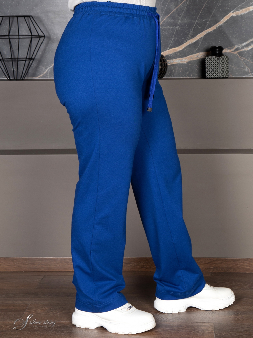 Ультрамодные брюки прямого покроя из трикотажного полотна «футер». Футер это один из самых востребованных современных материалов, который обладает эластичностью и устойчивостью к деформации. Лицевая сторона трикотажа выглядит, как кулирная гладь. С изнаночной стороны с помощью петельных протяжек нити прикрепляются к основе полотна, образуя своеобразную фактурность. Отличительная черта модели - это эластичный пояс и отсутствие застежек. Помимо эластичной тесьмы по поясу проходит шнур-затяжка. Это самые удобные брюки для повседневного ношения.