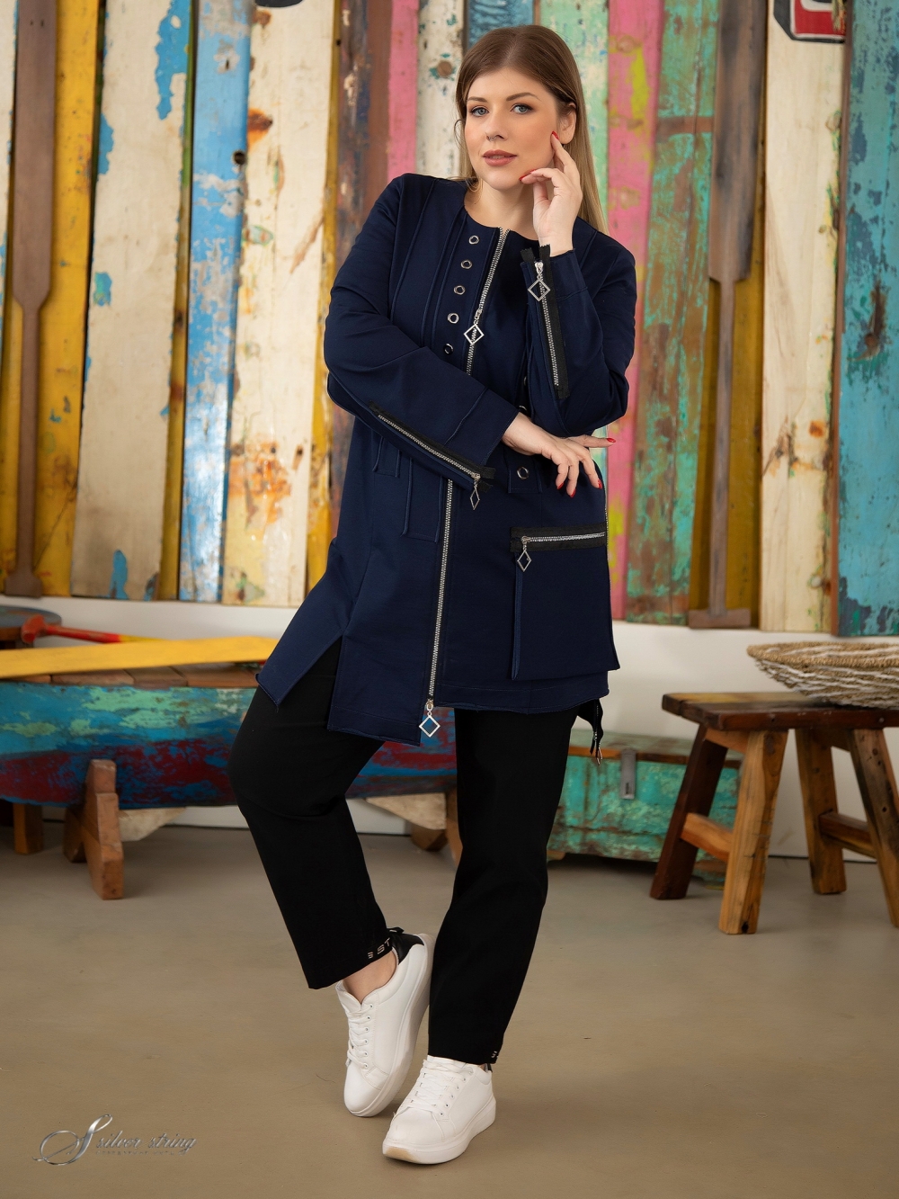 Ультрамодный жакет прямого силуэта выполнен из трикотажного полотна «футер». Футер это один из самых востребованных современных материалов, который обладает эластичностью и устойчивостью к деформации. Поэтому многие детали в изделии обработаны с открытым срезом. Модель асимметричного кроя: левая полочка короче правой. Усиливает эффект асимметрии разноуровневые накладные детали по борту и разная отделка по правому и левому боку. С левой стороны расположен отлетной карман, который как бы пристегивается к полочке на крупную молнию. Изделие с втачным, длинным рукавом. В локтевом шве обработан разрез, задекорированный молнией. Застежка - молния. Отделочные накладные детали подчеркнуты термоаппликацией. Оригинальный крой, эффектный декор - все это отвечает современным модным тенденциям и делает модель неповторимой.