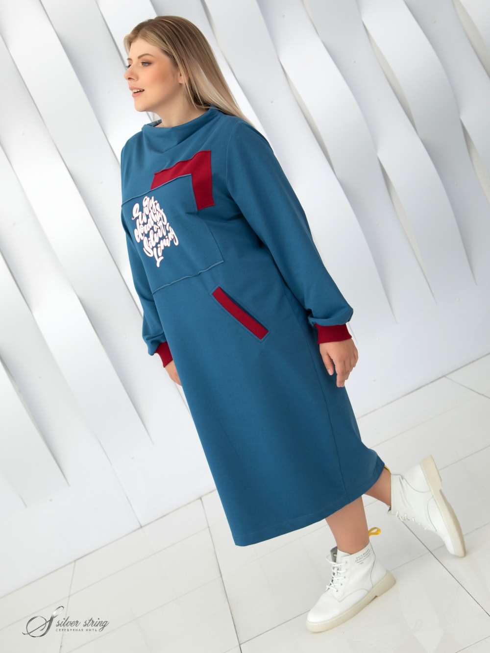 Яркий трикотажный джемпер прямого силуэта, стилизованный под «худи», изготовлен из трикотажного полотна «футер» на основе комбинации двух контрастных цветов. Футер это один из самых востребованных современных материалов, который обладает эластичностью и устойчивостью к деформации. Лицевая сторона трикотажа выглядит, как кулирная гладь. С изнаночной стороны с помощью петельных протяжек нити прикрепляются к основе полотна, образуя своеобразную фактурность. Модель с длинным втачным рукавом и капюшоном. Рукав, с притачной трикотажной манжетой. Кокетки полочки и спинки изготовлены из ткани-компаньона контрастного цвета. Вдоль боковых швов, со смещением на полочку, выполнена имитация застежки на пуговицы, под которой замаскированы разрезы. Короткая застежка- молния расположена по центру капюшона. На левом боку обработан прорезной карман с молнией. Завершает образ яркий принт, нанесенный по полочке и спинке. При изготовлении принта использовались специальные пластификаторы, которые позволяет рисунку выдерживать длительную эксплуатацию. Удобный крой, эффектный дизайн - все это отвечает современным модным тенденциям и делает модель неповторимой.