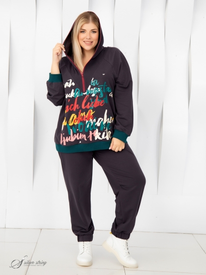 Яркий трикотажный джемпер прямого силуэта, стилизованный под «худи», изготовлен из трикотажного полотна «футер». Футер это один из самых комфортных для тела материалов. Лицевая сторона трикотажа выглядит, как кулирная гладь. С изнаночной стороны с помощью петельных протяжек нити прикрепляются к основе полотна, образуя своеобразную фактурность. Благодаря введению полиэстера и лайкры, футер приобретает эластичность, становится более устойчивым к деформациям, прочным и долговечным. Модель с капюшоном. Со спинки на полочку переходит кокетка треугольной формы, выполненная из кашкорсе - полотна по фактуре напоминающего «английскую резинку». Застежка, на молнию контрастного цвета, берет начало от нижнего угла кокетки и проходит по вырезу капюшона. Рукав длинный, покроя реглан, с притачной трикотажной манжетой из отделочного материала. Аналогично обработан и низ изделия. Завершает образ яркий принт, нанесенный по центру полочки. При изготовлении принта использовались специальные пластификаторы, которые позволяет рисунку выдерживать длительную эксплуатацию. В модели органично сочетаются современные материалы с оригинальным дизайном.