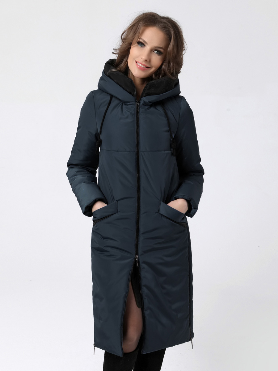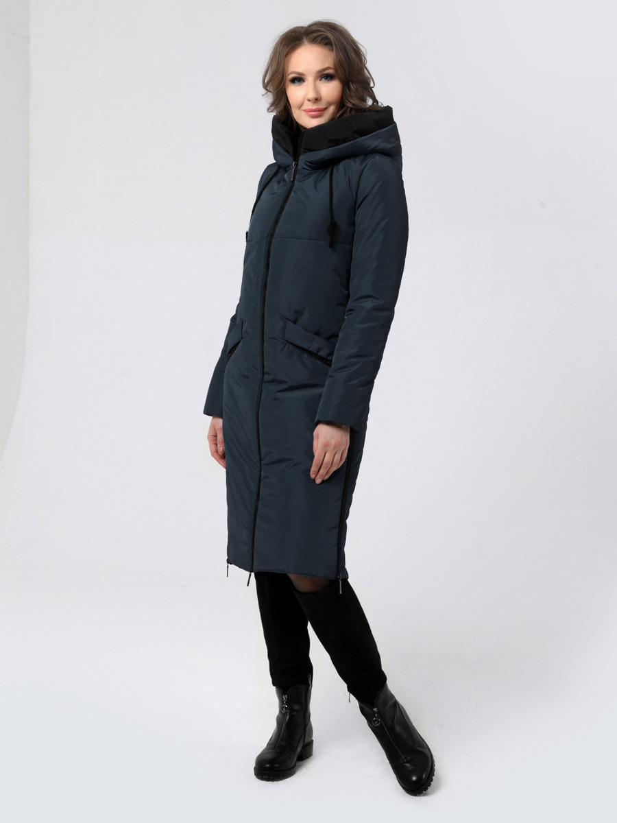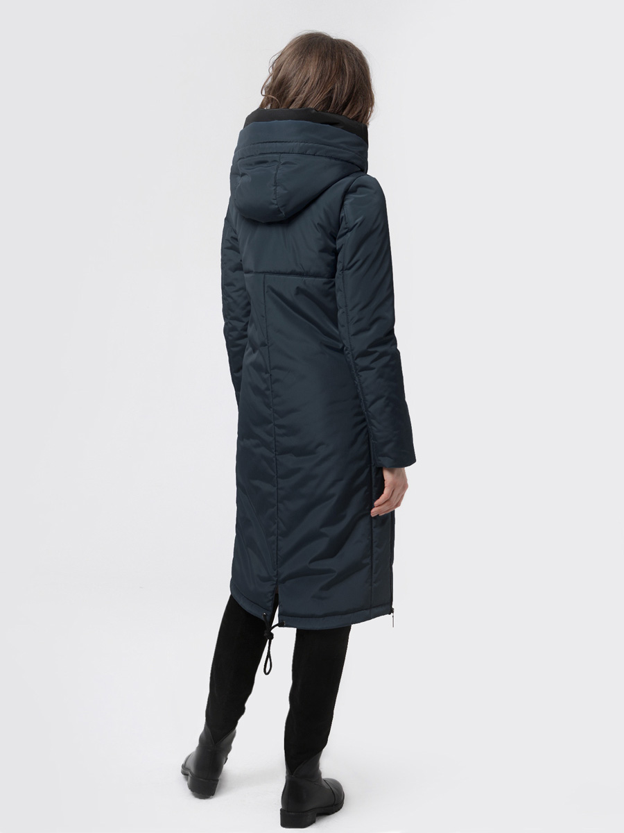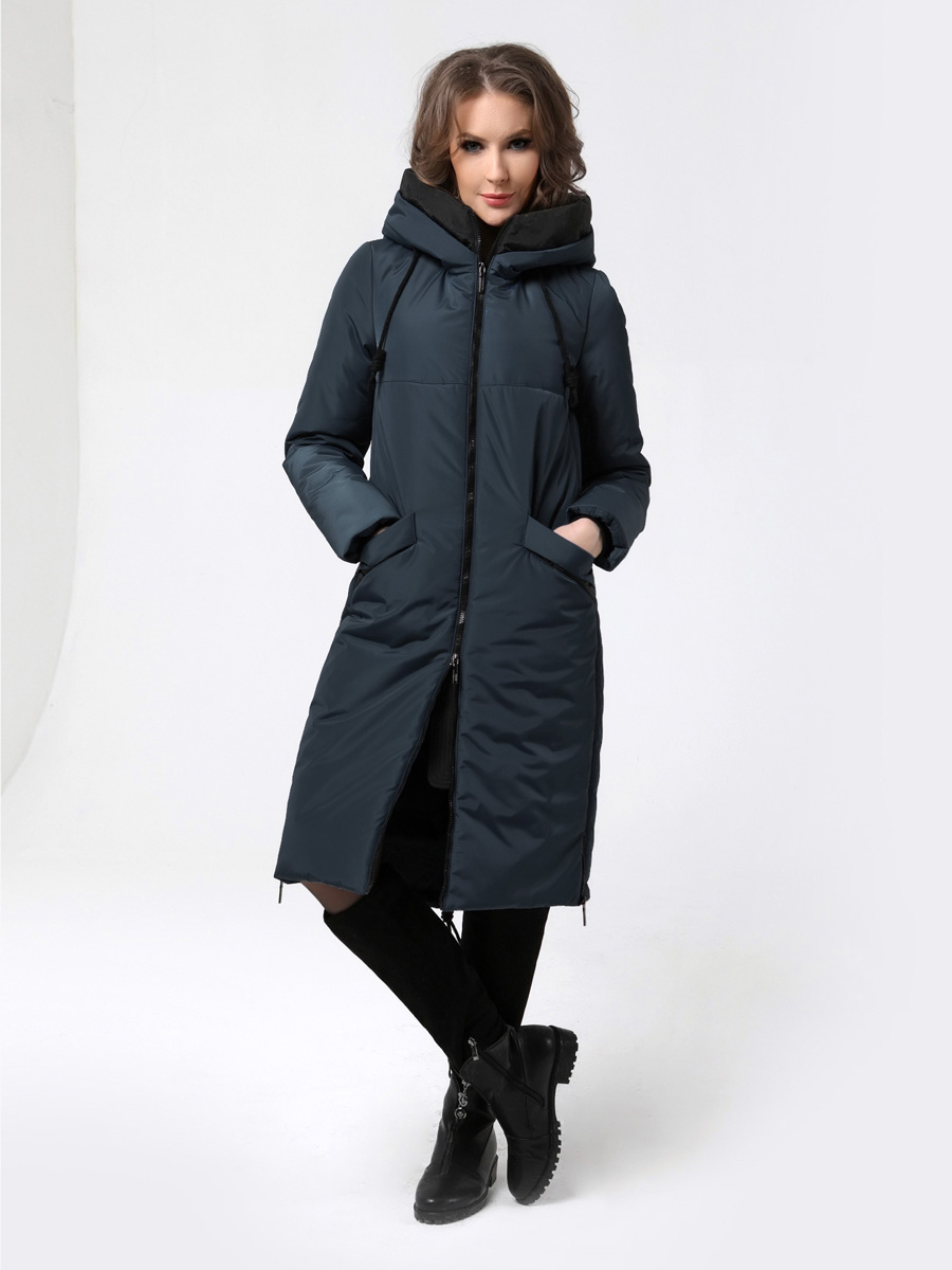 Пальто прямого силуэта с втачными рукавами и застежкой на двухзамковую молнию. Воротник - уютная двойная стойка, переходящая в капюшон. В качестве отделки использована ткань и фурнитура черного цвета (молнии в боковых швах несут только декоративную функцию). Карманы - прорезные с листочкой. Есть внутренний карман на молнии. Подкладка изделия по цвету совпадает с тканью верха.