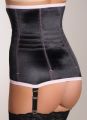 Корсетный пояс большой степени коррекции. Пояс выполнен из сатиновой блестящей ткани черного цвета и украшен розовой кружевной вставкой спереди. Особый крой и высокотехнологичное выполнение круговых швов позволяет уменьшить объем талии на 2 размера. Корсетные косточки настолько удобны, что позволяют не только корректировать фигуру, но и распределять нагрузку на мышцы спины, облегчая повседневную носку.