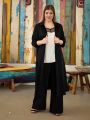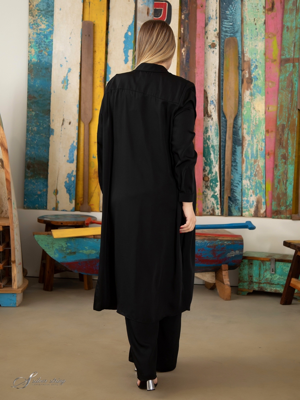 Удлиненный блузон - «шазюбль» прямого силуэта выполнен из шелковистой смесовой ткани. Модель с длинным втачным рукавом на манжете. Обхват манжеты можно регулировать с помощью парных пуговиц. Воротник рубашечный, на стойке. На полочке расположена застежка на пуговицы. В боковых швах обработаны высокие разрезы. Один из главных плюсов шазюбля — его универсальность, отличная способность сочетаться с вещами в разнообразных стилях и дополнять разные комплекты. Шазюбль можно носить с брюками, юбками, платьями; с длинными и короткими вещами, с классической, спортивной и одеждой в стиле «Casual». Второй плюс — способность создавать вертикаль и вытягивать фигуру, скрывая недостатки и добавляя стройности.