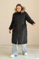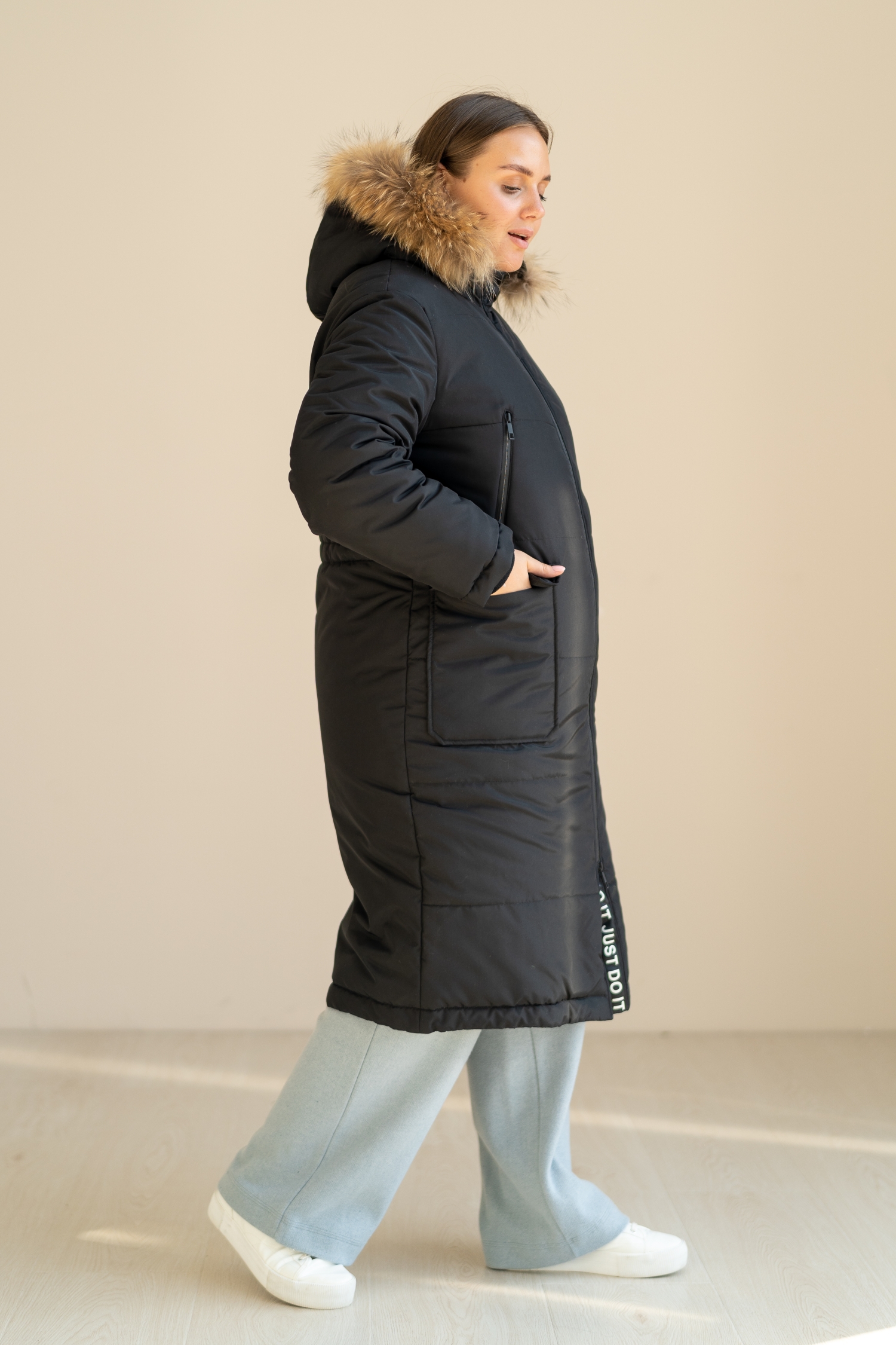 Женское зимнее длинное черное пальто больших размеров с натуральным мехом на капюшоне от бренда Modress (Модресс). Пальто прямого силуэта типа «парка». Капюшон втачной, мех съемный. Рукава втачныеодношовныес внутренними трикотажными манжетами. Боковые карманы накладные с клапанами, нагрудные карманы на молниях. На спинке по талии проходит кулиска, регулируемая изнутри. По низу изделия проходит кулискас резинкой. Пальто застегивается на спиральную молнию (прорезиненные водоотталкивающие молнии). В качестве отделки использована декоративная тесьма на внутренней планке.