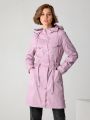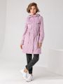 Укороченный плащ прямого силуэта с рукавами покроя реглан и застежкой на двухзамковую молнию и кнопки. Воротник - стойка, переходящая в капюшон. Линию талии при желании можно подчеркнуть с помощью кулиски. Верхние карманы расположены под отлетной кокеткой, нижние - между боковым и рельефным швами. Есть внутренний кармашек на молнии. Ширину по низу изделия можно регулировать затяжкой. Подкладка выполнена из ткани в мелкую полоску.