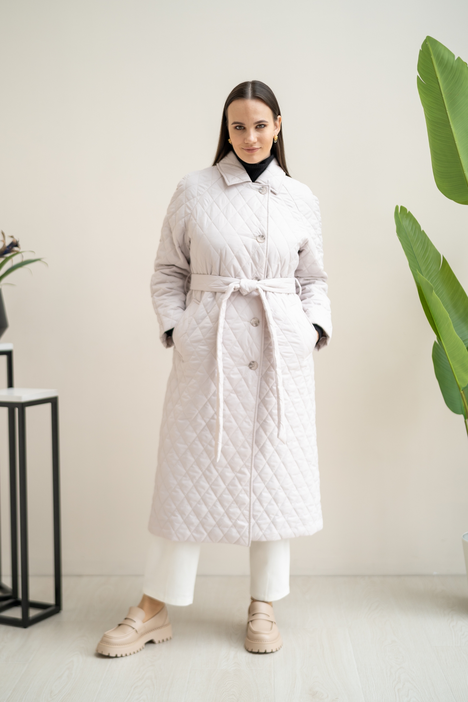 Описание: Женское демисезонное стеганое пальто больших размеров в молочном цвете от бренда Modress (Модресс). Пальто длинное прямого силуэта из стеганой ткани. Воротник отложной. Рукава реглан. Боковые карманы с листочками. В среднем шве спинки выполнена шлица. Застегивается пальто на петли и пуговицы. Ассиметричная застежка позволяет преобразовать воротник в английский с лацканами. Имеется съемный пояс.