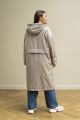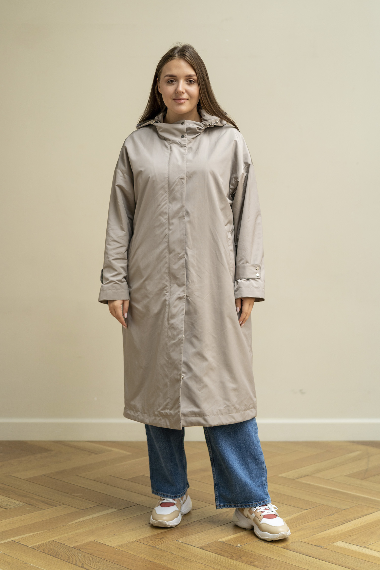 Женский демисезонный бежевый плащ больших размеров от бренда Модресс (Modress). Плащ длиной миди, прямого, свободного кроя. Плечевой пояс спущенный. Рукава прямые с патами. Воротник стойка, к которой с внутренней стороны пристегивается капюшон с кулиской. По талии спинки проходит кулиска, скрытая имитированной отлетной кокеткой. Плащ застегивается на супатную молнию и кнопки. Внизу изделия также имеется кулиска с регулируемой резинкой.