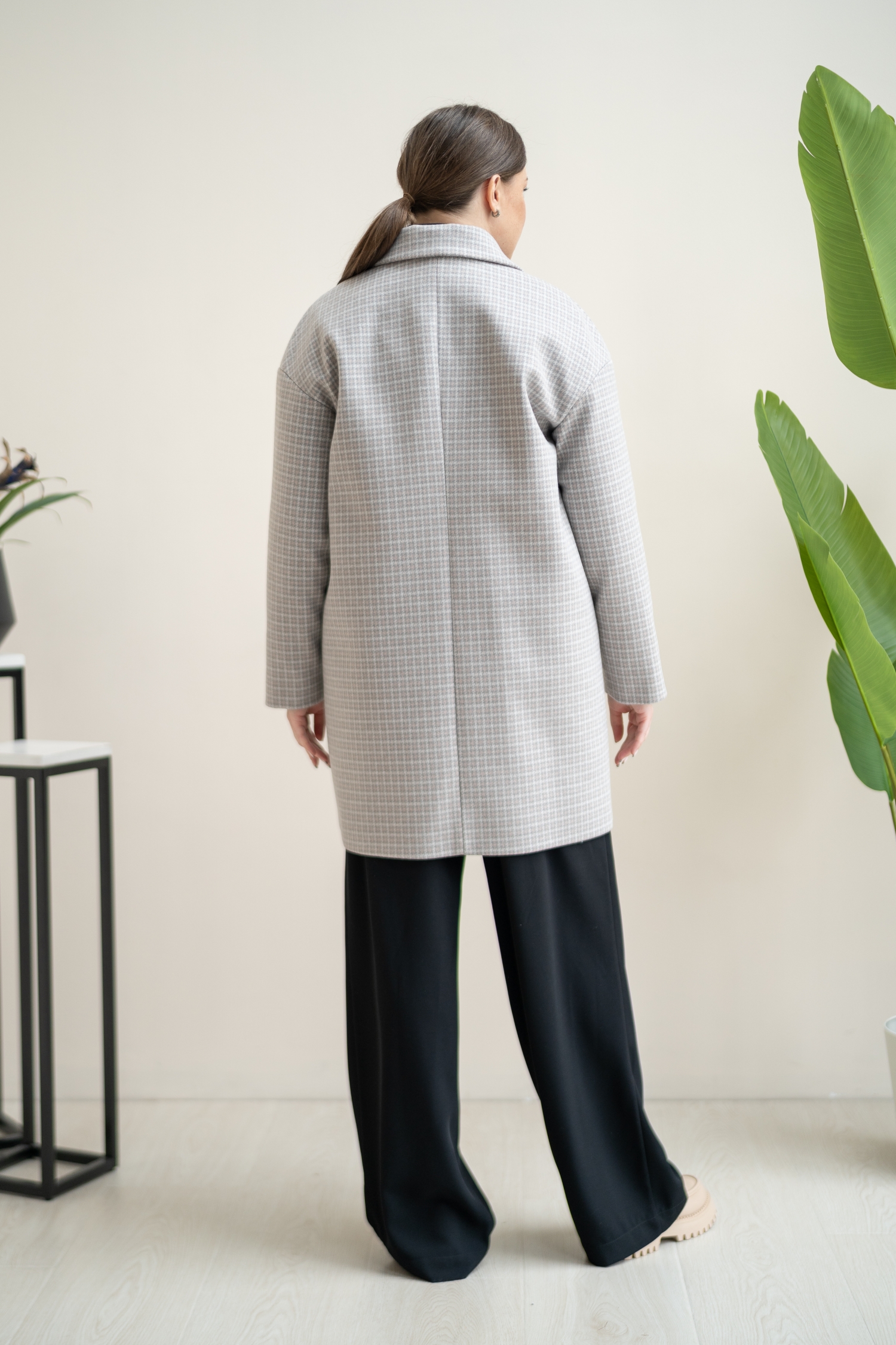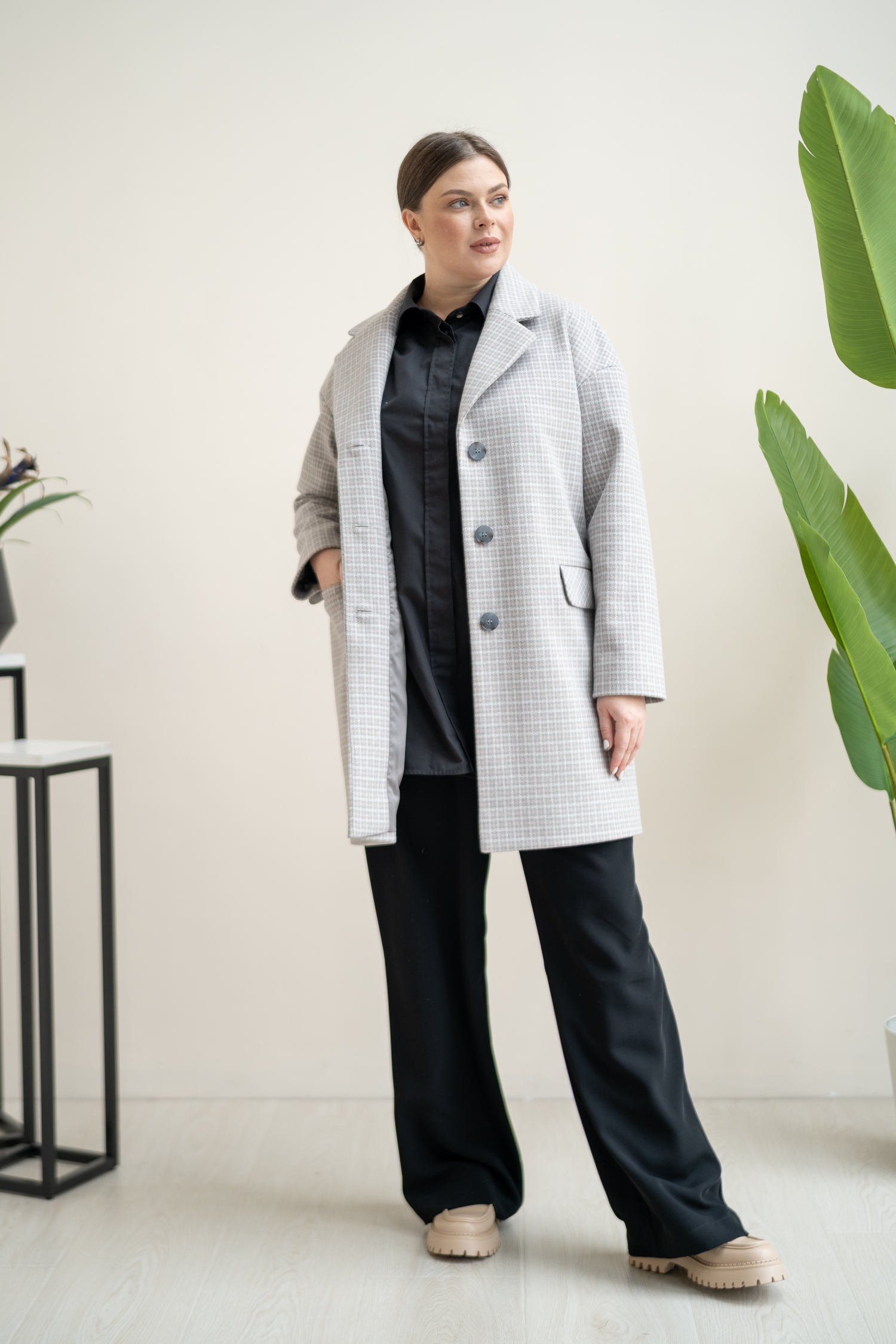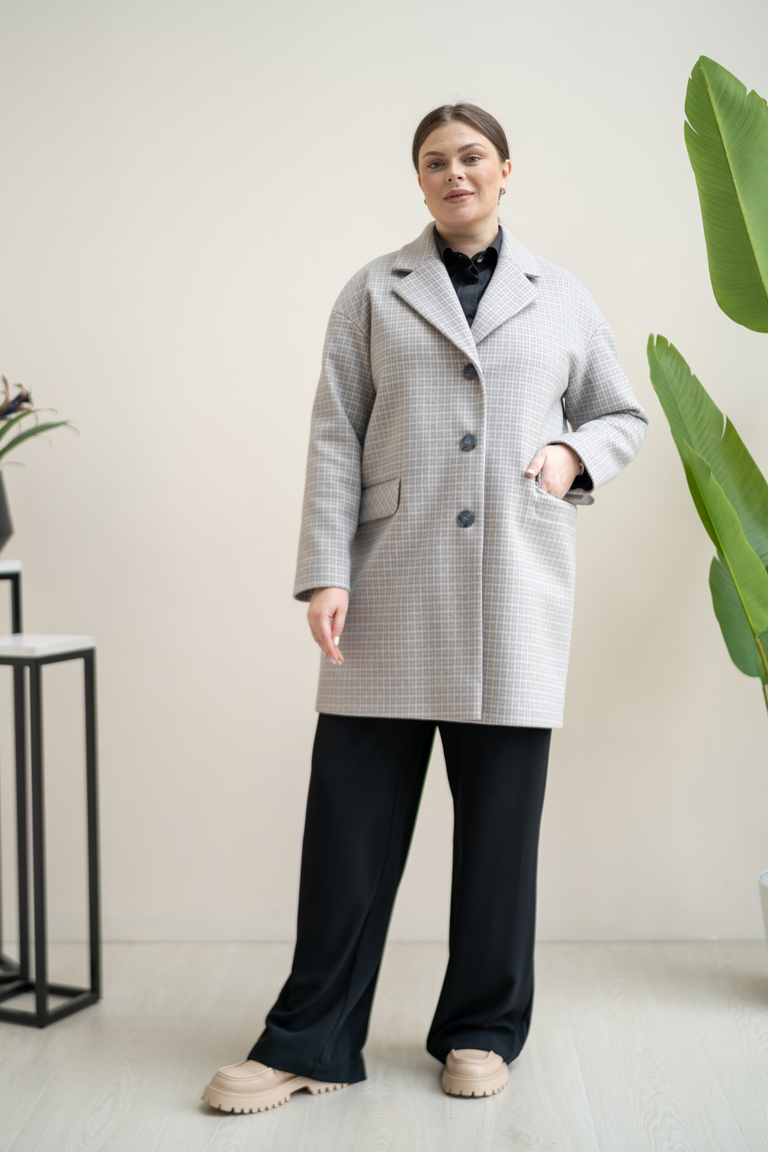 Женское демисезонное серое в клетку драповое полупальто больших размеров от бренда Модресс (Modress). Пальто свободного кроя с английским воротником. Рукава спущенные. Пальто однобортное, длиной выше колен, застегивается на петли и пуговицы. Карманы горизонтальные с клапаном, пиджачного типа.