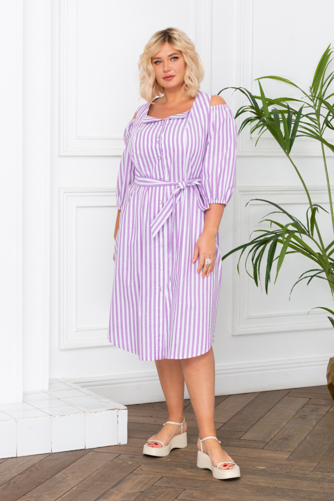 Эффектное летнее платье, объединяющее в себе стили морской и прованс. Силуэт платья трапециевидный, с закругленным низом изделия. Оригинальной формы рукава на резинке пикантно приоткрывают линию плеч. Застежка по центру на пуговицы. Длина по спинке 116 см