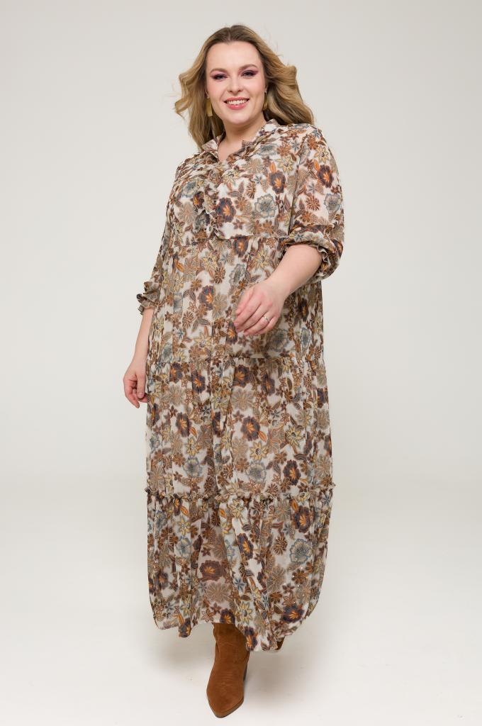 Стильное платье силуэта трапеция, на подкладке, отрезное по талии. Выполнено из струящегося шифона - приятного и легкого, подклад мягкий шифон. Нижняя часть платья - волан, собранный на сборку, придает походке легкость. Свободный рукав- сборка по окату, по низу рукав собран на резинку, которая позволяет регулировать длину рукава. Волан по низу рукава прикрывает несовершенства и делает движения более плавными и женственными. Горловина V- образная с лежачим воротником стойка.