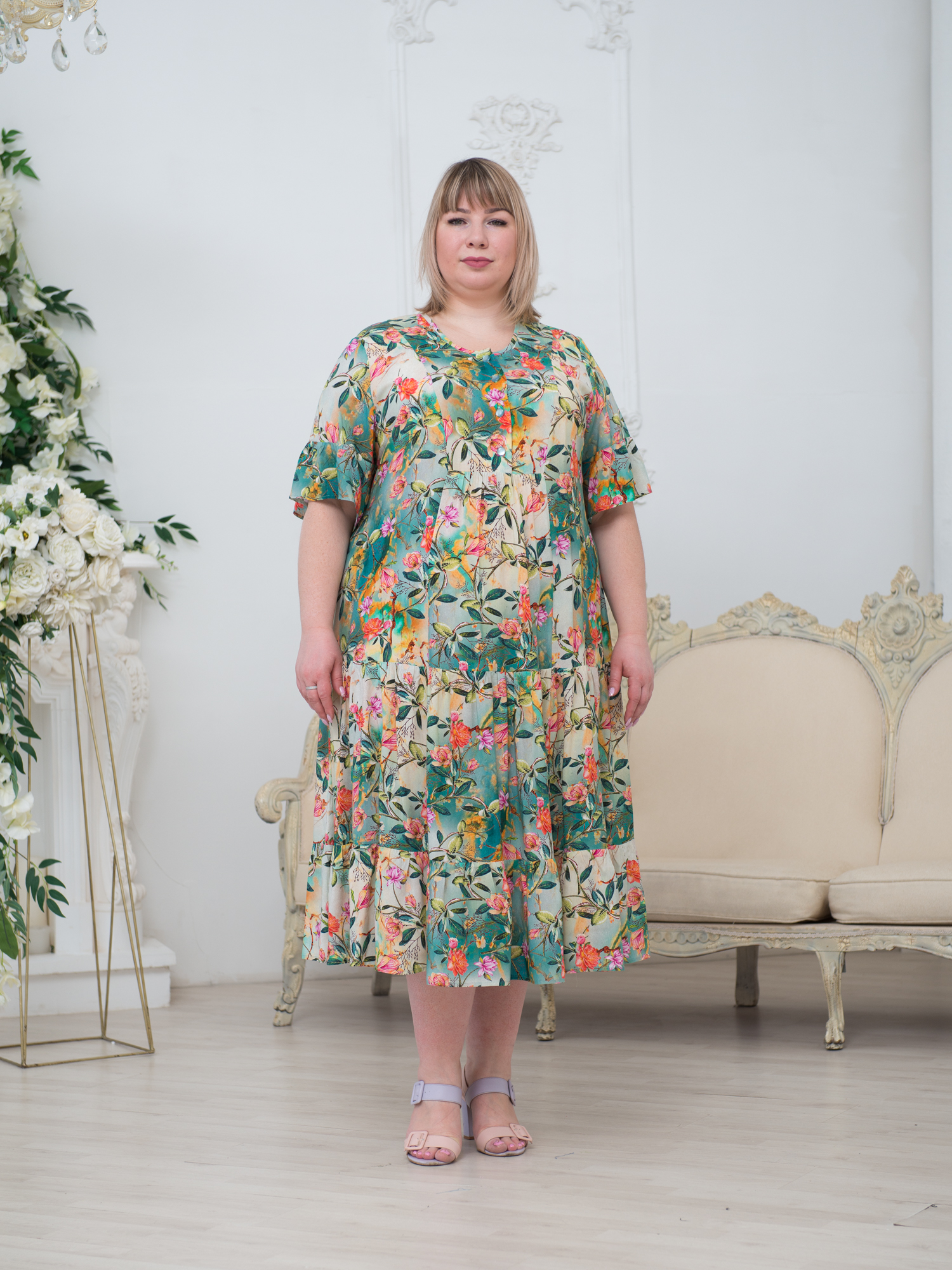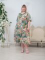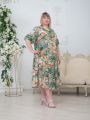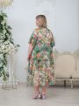 Описание: Женское светло-зеленое платье миди с цветочным принтом из вискозы больших размеров. Рукав с оборкой, длиной до локтя, длина по спинке 125 см