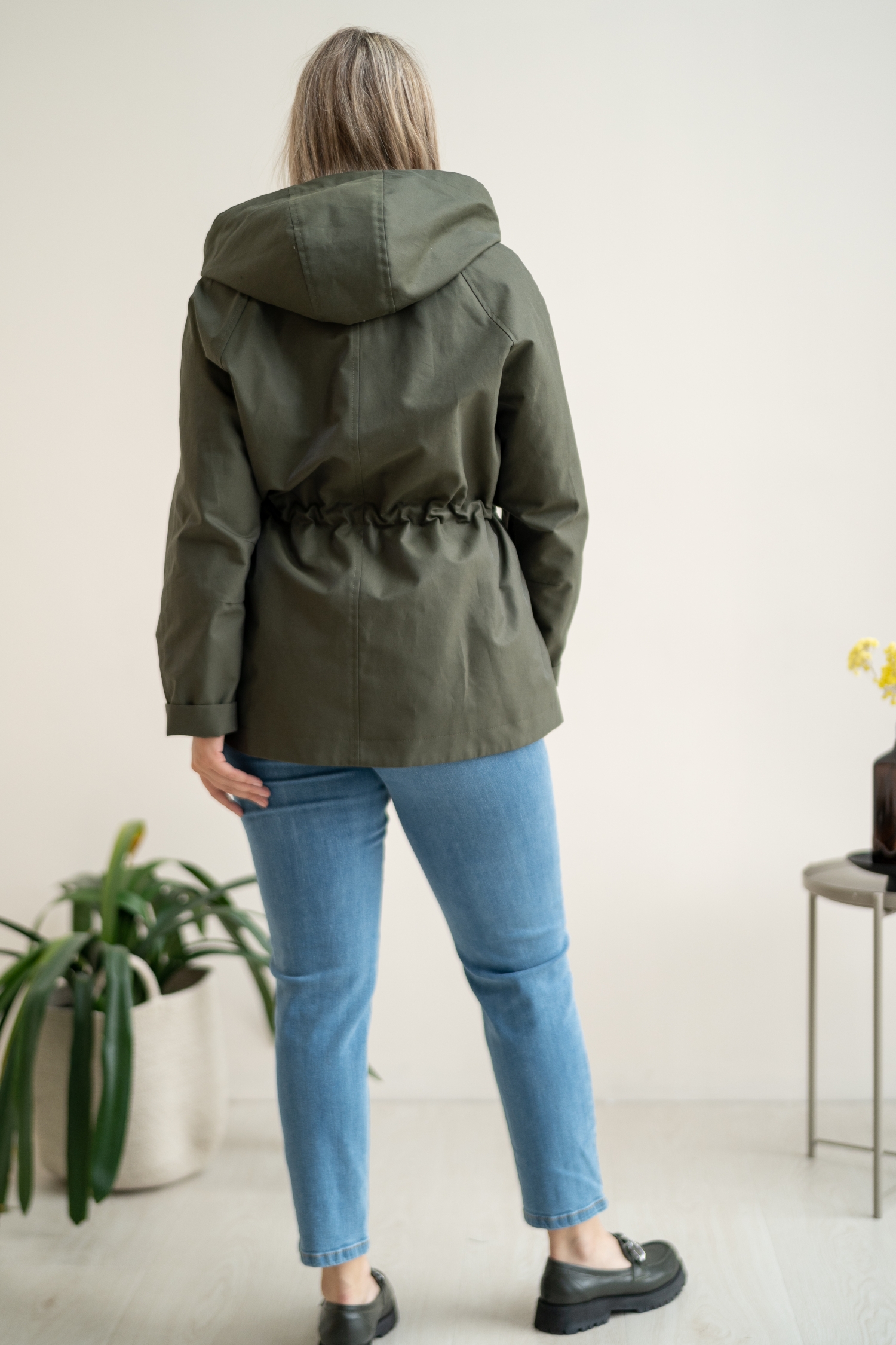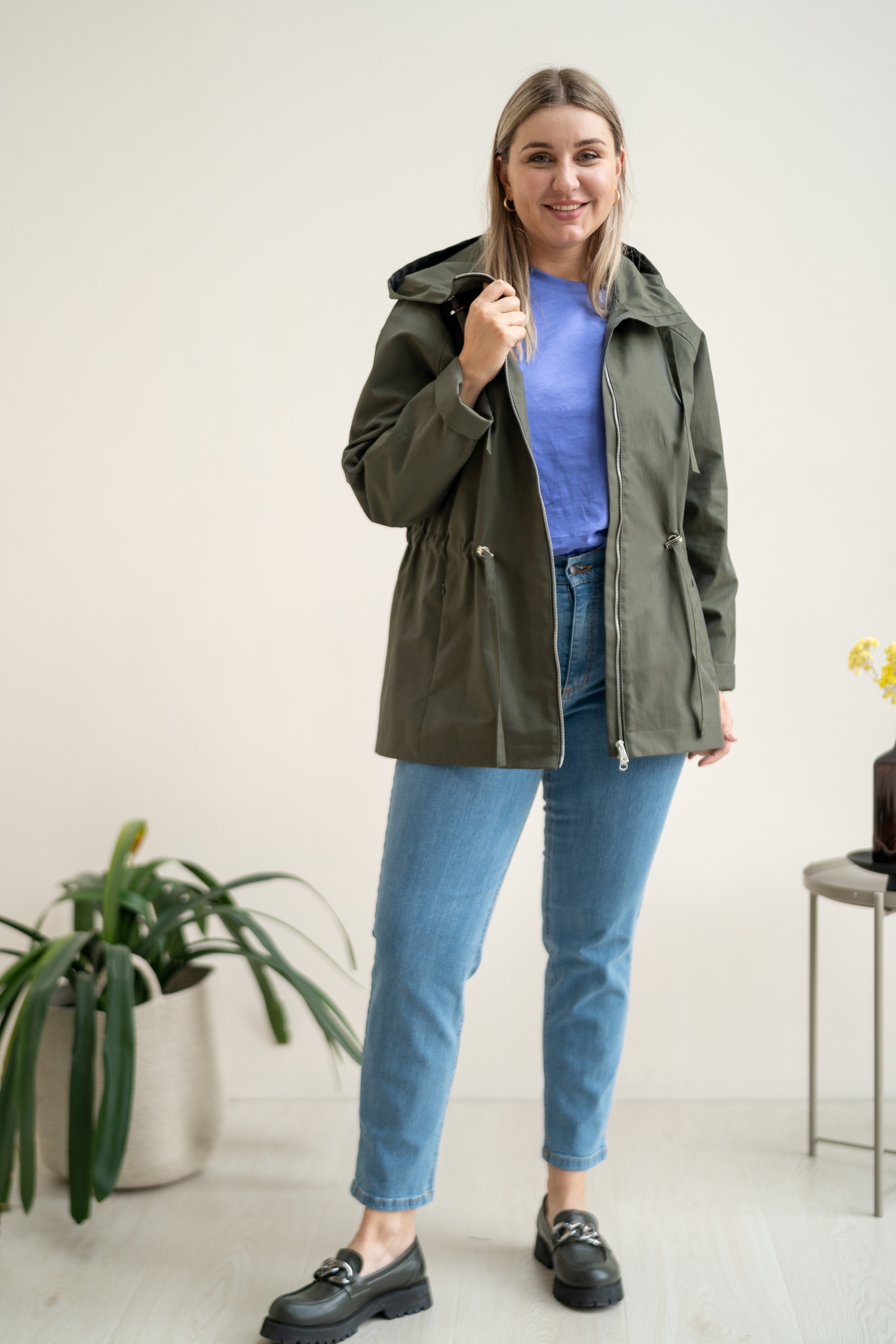 Ветровка прямого силуэта с кулиской на талии. Длина до бедер. Капюшон втачной со стойкой и кулиской. Рукав реглан, широкий с предусмотренным отворотом. Карманы выполнены в рельефах и застегиваются на потайные молнии. Изделие застегивается на металлическую молнию. Ветровка выполнена из плащевой ткани с большим содержанием хлопка.