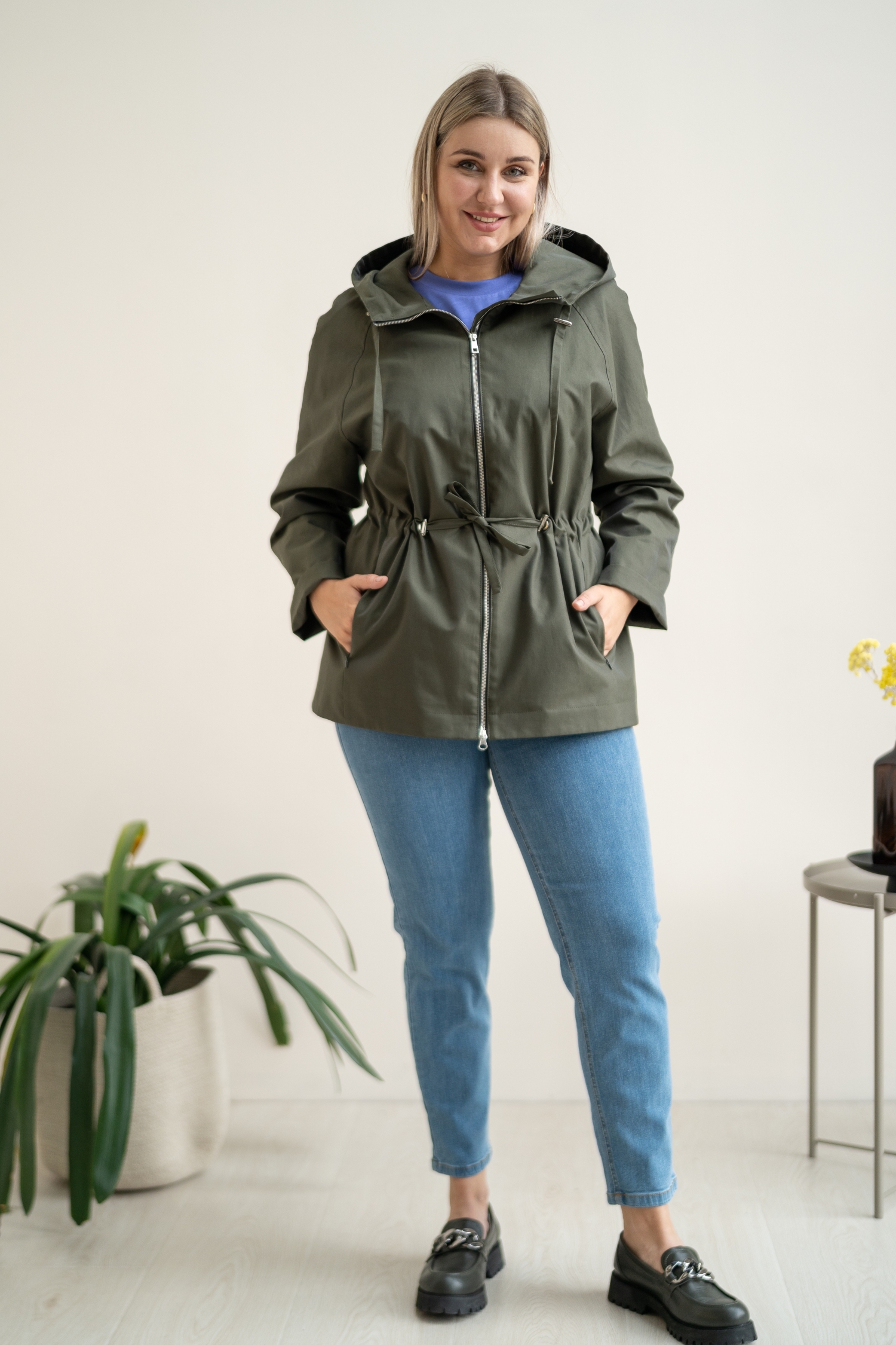 Описание: Ветровка прямого силуэта с кулиской на талии. Длина до бедер. Капюшон втачной со стойкой и кулиской. Рукав реглан, широкий с предусмотренным отворотом. Карманы выполнены в рельефах и застегиваются на потайные молнии. Изделие застегивается на металлическую молнию. Ветровка выполнена из плащевой ткани с большим содержанием хлопка.