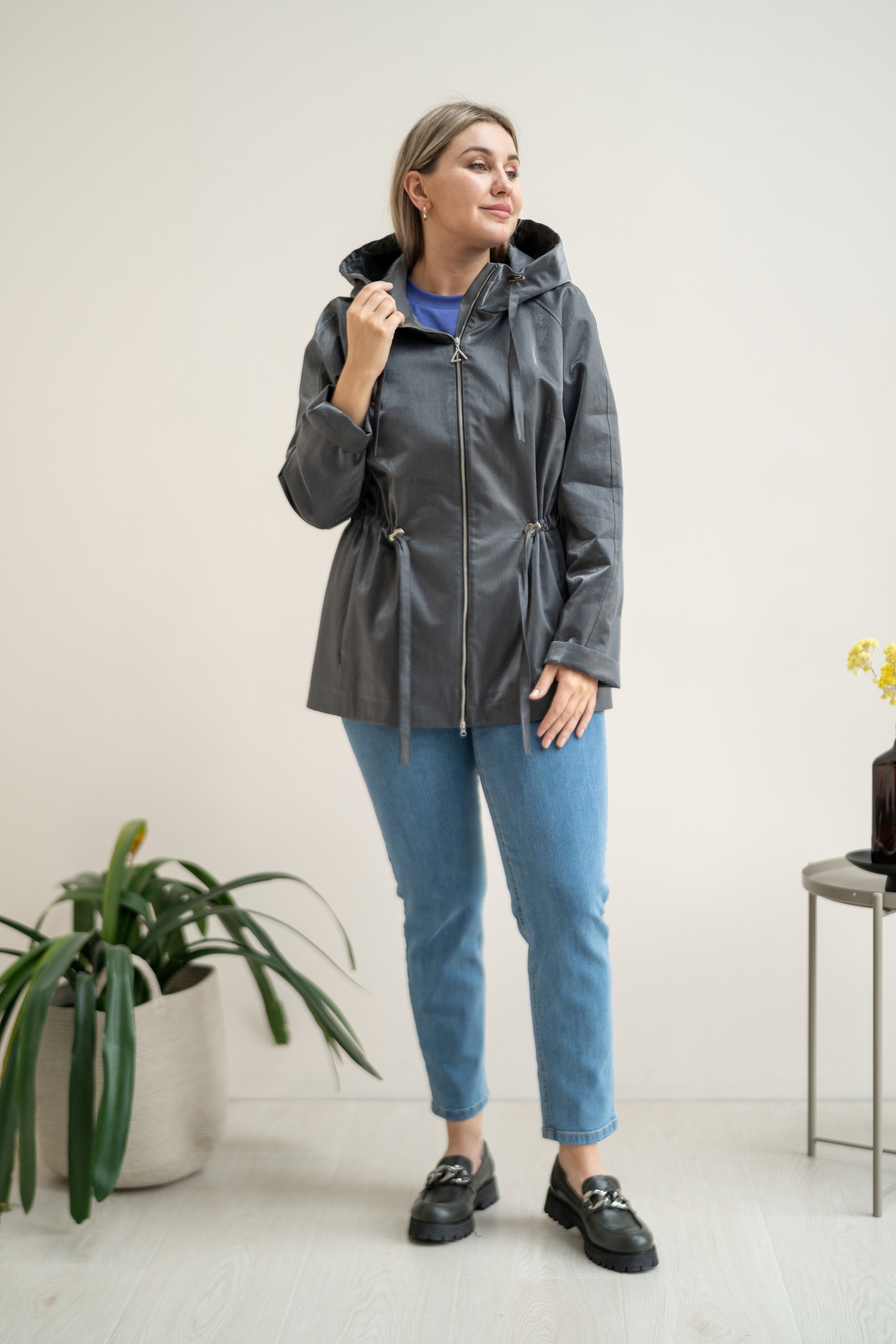 Описание: Ветровка прямого силуэта с кулиской на талии. Длина до бедер. Капюшон втачной со стойкой и кулиской. Рукав реглан, широкий с предусмотренным отворотом. Карманы выполнены в рельефах и застегиваются на потайные молнии. Изделие застегивается на металлическую молнию. Ветровка выполнена из плащевой ткани с большим содержанием хлопка.