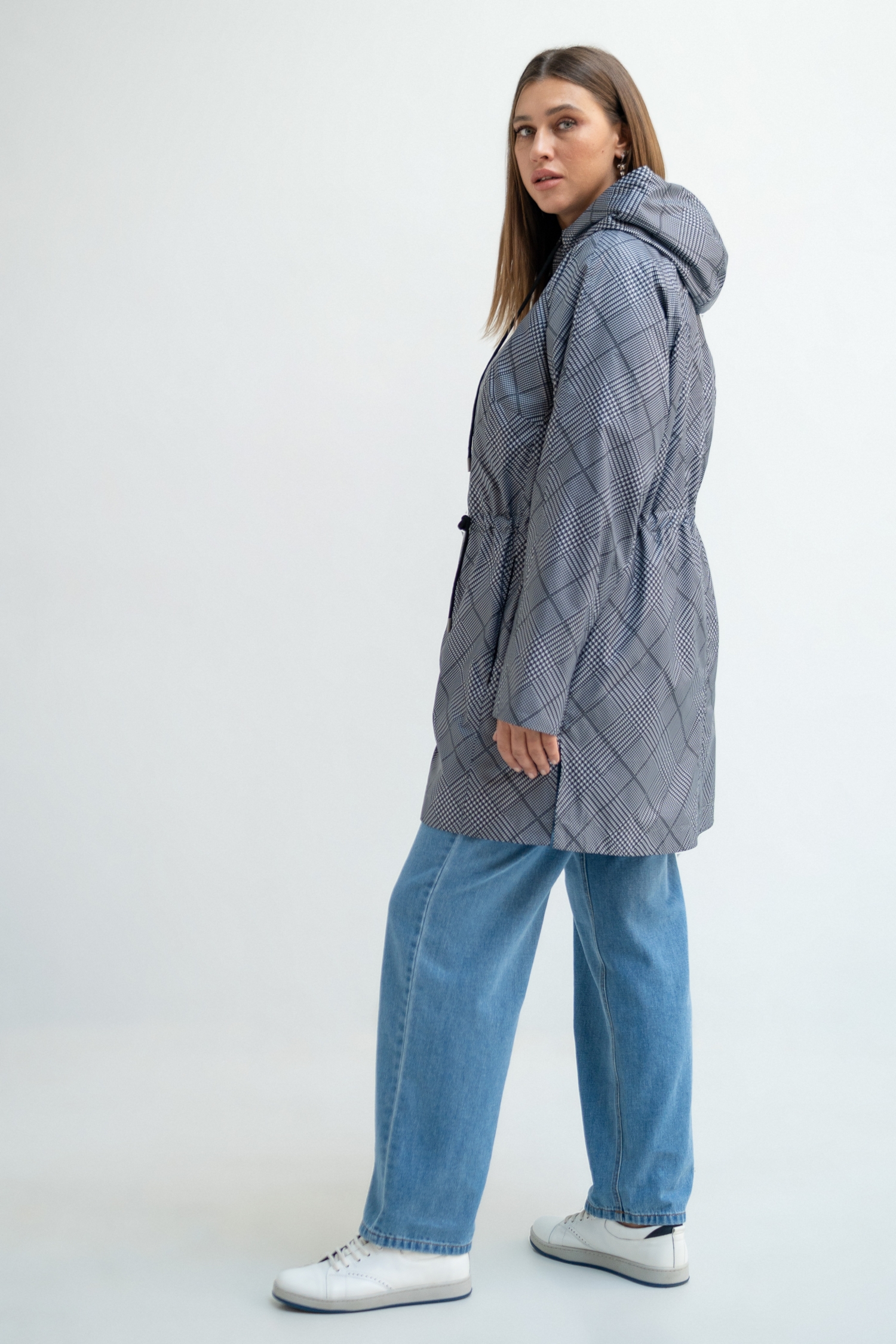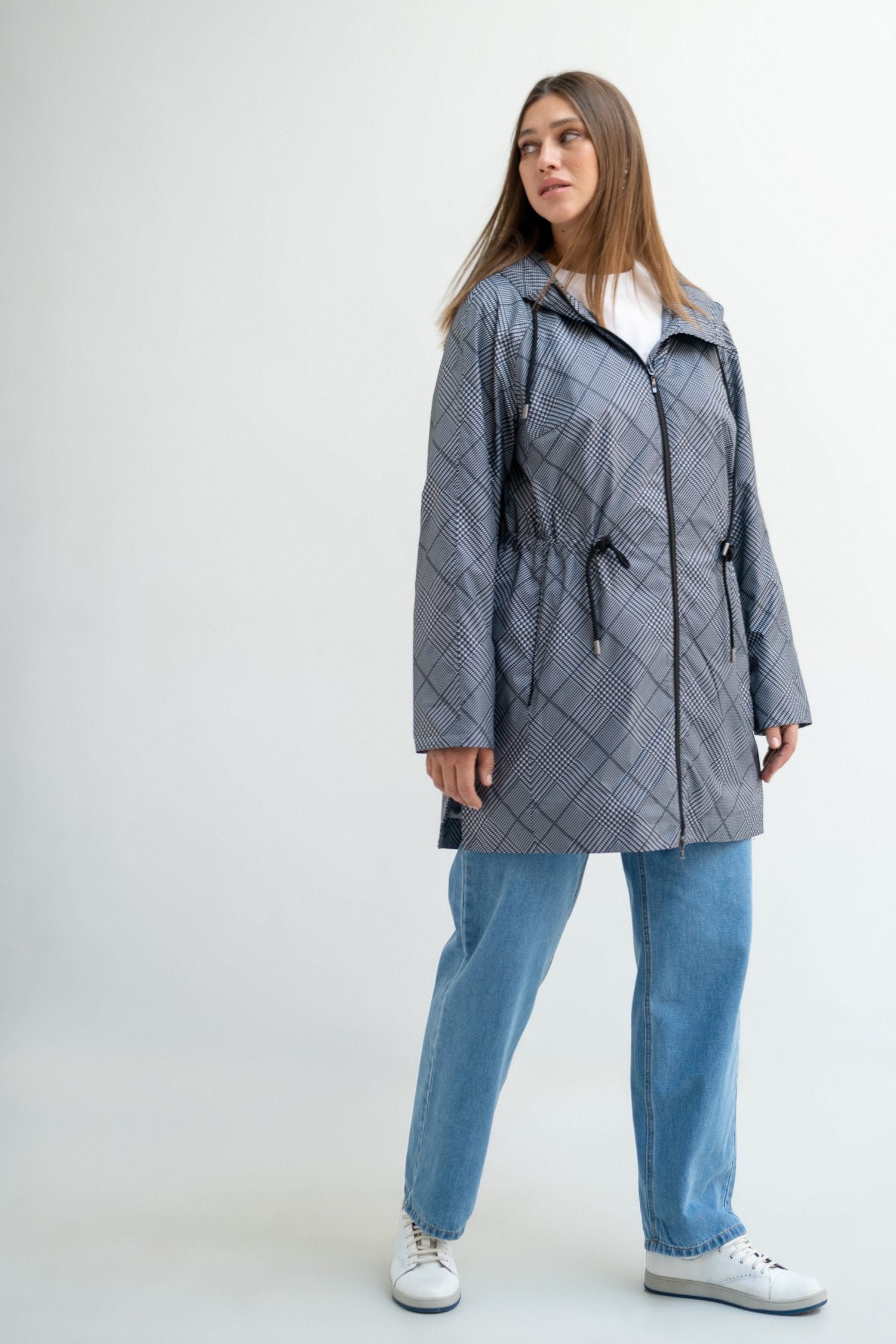 Ветровка прямого силуэта с кулиской на талии. Длина ниже середины бедра. Рельеф и нагрудная вытачка обеспечивают хорошую посадку на большие размеры. Капюшон втачной со стойкой и кулиской. Рукав реглан, широкий с предусмотренным отворотом. Карманы в рельефах на потайных молниях. В боковых швах разрезы. Изделие застегивается на молнию.