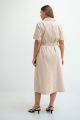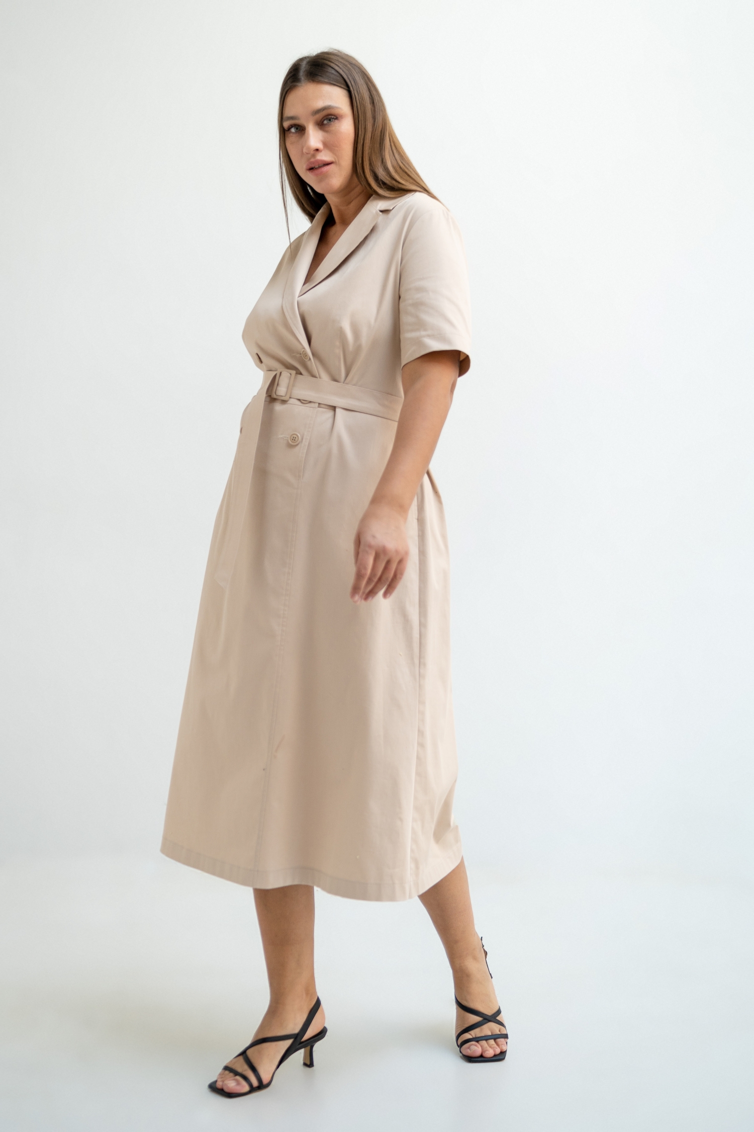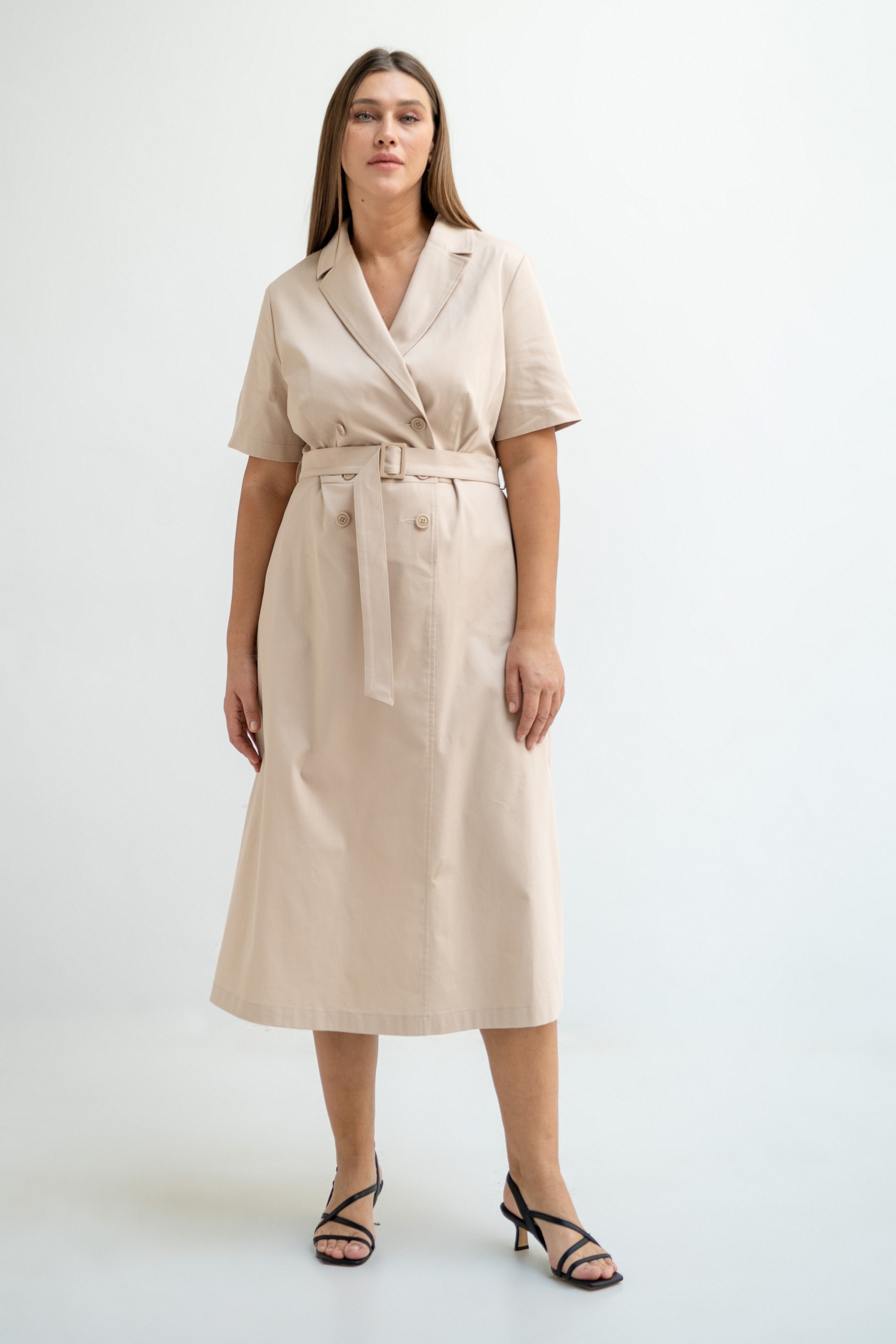 Платье, отрезное по линии талии, длиной ниже колен. Лиф прилегающий -нагрудные вытачки обеспечивают хорошую посадку. Воротник «английский», рукава втачные, короткие. Юбка расклешенная, с карманами в боковых швах. Платье застегивается спереди на петли и пуговицы, имитируя двубортную застежку. Имеется съемный пояс с пряжкой.