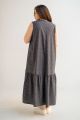 Платье макси А-силуэта, с широкой оборкой по низу. Вырез горловины круглый, с глубоким разрезом на пуговицах. Нагрудная вытачка переведена в горловину в виде сборки. В боковых швах выполнены карманы (они занижены по модели). Платье имеет плавно оформленный низ -спинка немного длиннее переда.