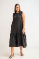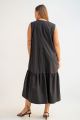Платье макси А-силуэта, с широкой оборкой по низу. Вырез горловины круглый, с глубоким разрезом на пуговицах. Нагрудная вытачка переведена в горловину в виде сборки. В боковых швах выполнены карманы (они занижены по модели). Платье имеет плавно оформленный низ -спинка немного длиннее переда.