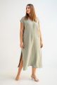 Платье макси А-силуэта. Вырез горловины V-образный. Плечевой пояс спущен, без рукавов. Нагрудная вытачка обеспечивает хорошую посадку. На спинке выполнен подрез, визуально вытягивающий фигуру. В боковых швах выполнены карманы (они занижены по модели). Также есть боковые разрезы, обеспечивающие свободу движению.