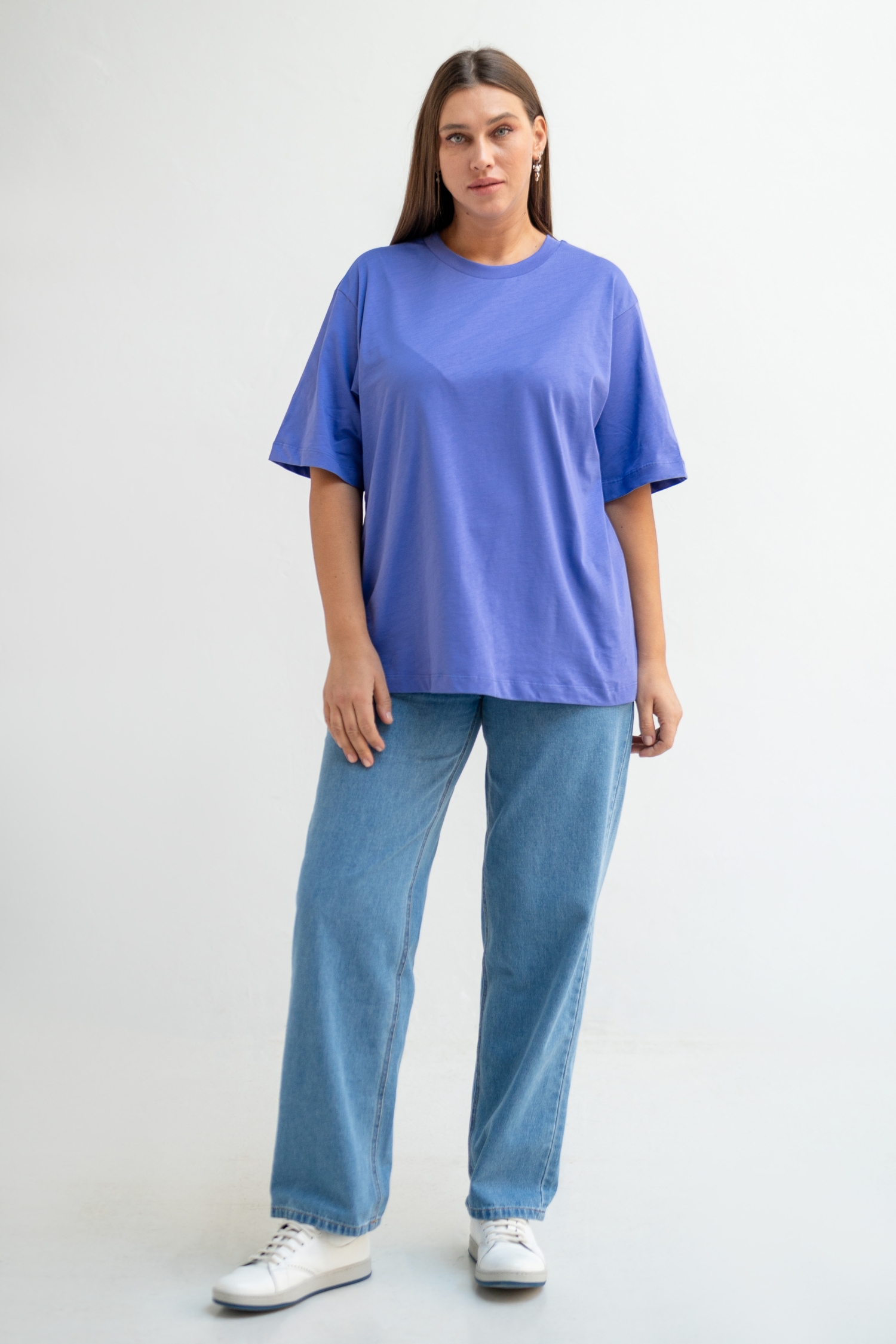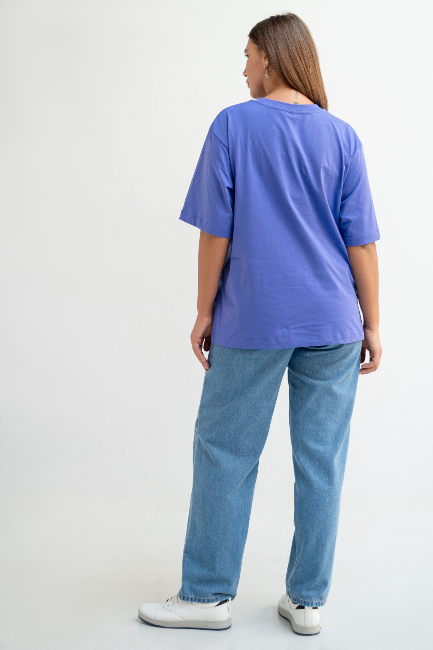Описание: Блузон типа Т-shirtпрямого силуэта, длиной до бедер. Рукава короткие прямые, вырез горловины круглый. В боковых швах небольшие разрезы. Рукава и низ изделия имеют широкую эффектную подгибку. Блузон выполнен из высококачественного 100% хлопкового трикотажа.